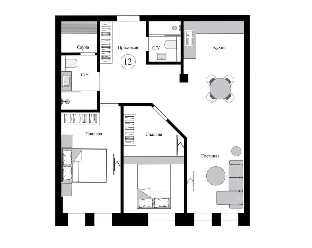 Апартаменты Комфорт + 012. Современный номер повышенной комфортности, светлый и просторный, имеет все необходимое для комфортного длительного проживания. Располагает просторной гостиной, совмещенной с кухней, 2 спальнями, отдельной ванной комнатой с сауной и дополнительной гостевой ванной комнатой. Услуги в номере: Умная колонка Яндекс Станция Лайт с Алисой, кабельное ТВ, кухонные принадлежности, варочная панель, духовой шкаф, посудомоечная машина, стиральная машина, чайная станция, микроволновая печь, кондиционер, сейф, гладильная доска, утюг, халат, тапки, фен, полотенца, сауна, Wi-Fi. Обращаем Ваше внимание на то, что некоторые декоративные элементы не предоставляются в базовой комплектации и размещены в номерах исключительно для фотографий.