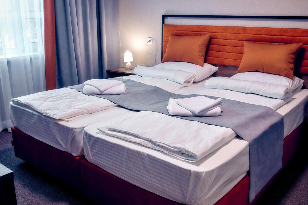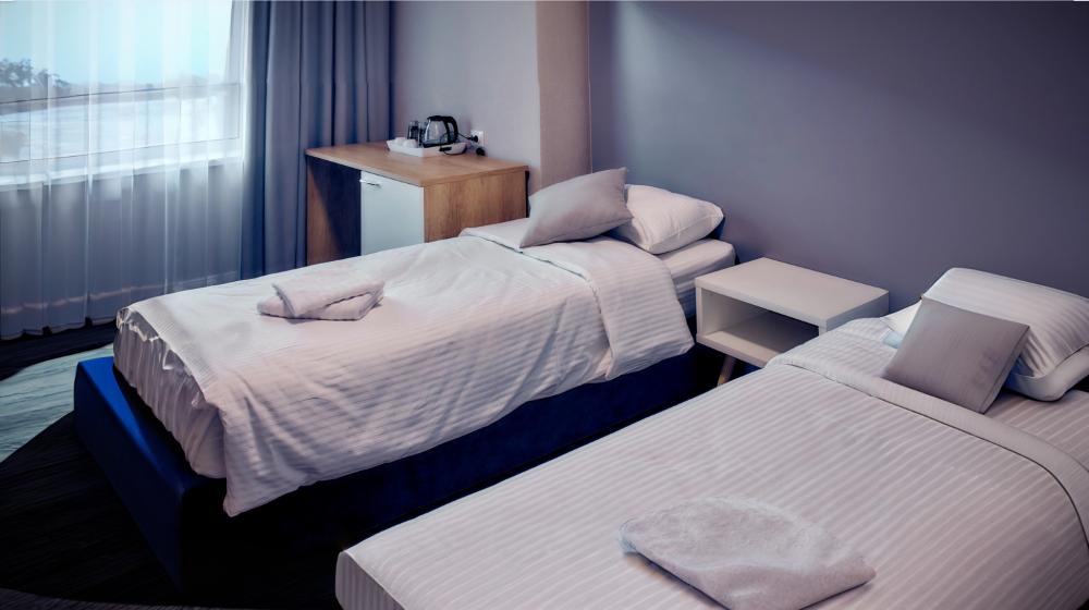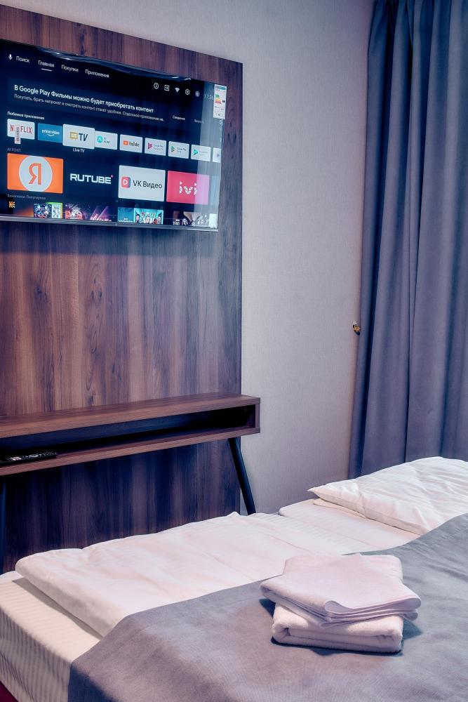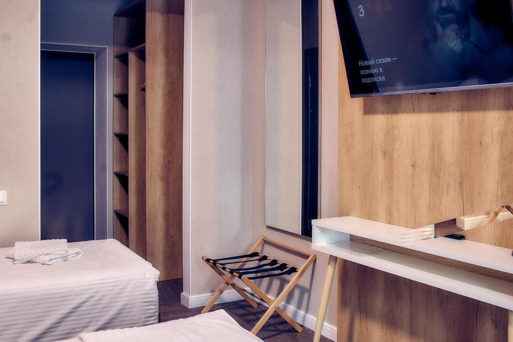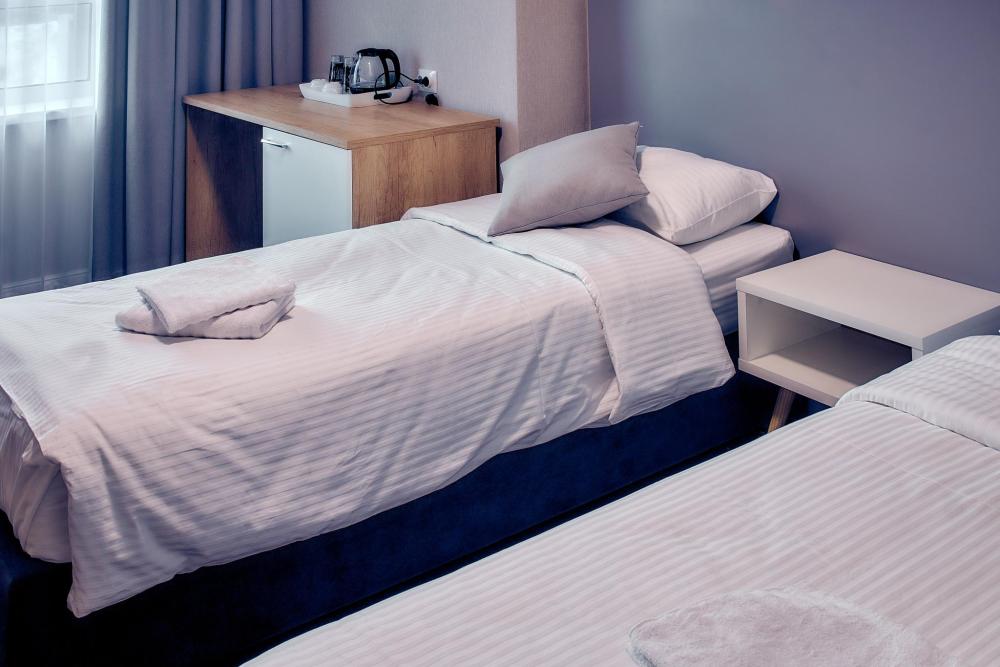 Уютный номер для 2 гостей, оборудованный всем необходимым для комфортного проживания. В номере: две односпальные кровати, при необходимости объединяются в двуспальную, прикроватные тумбочки, телефон, телевизор, санузел с душем.