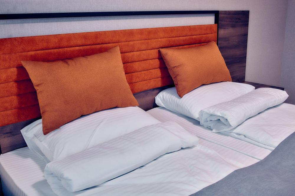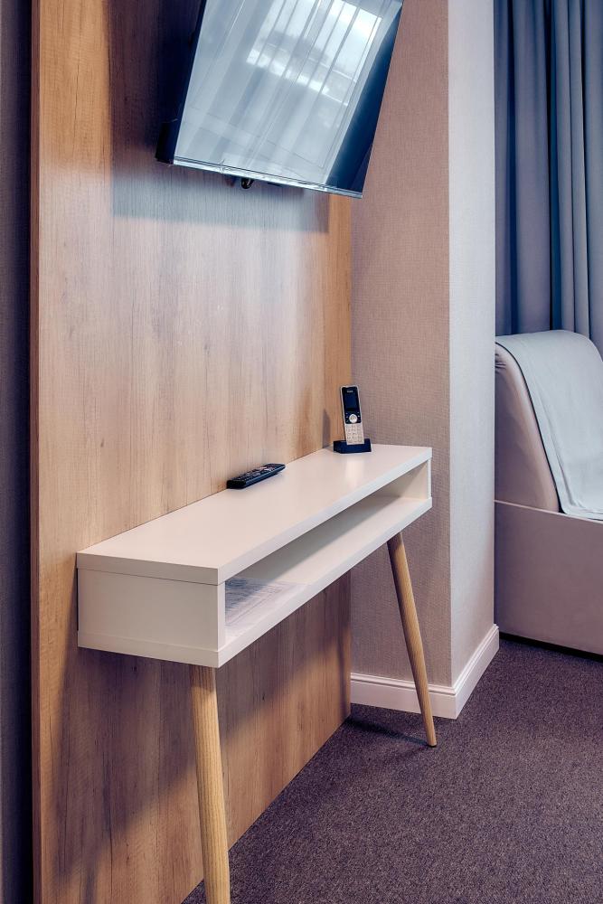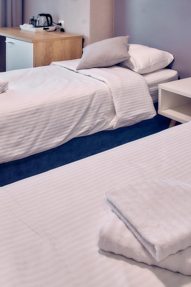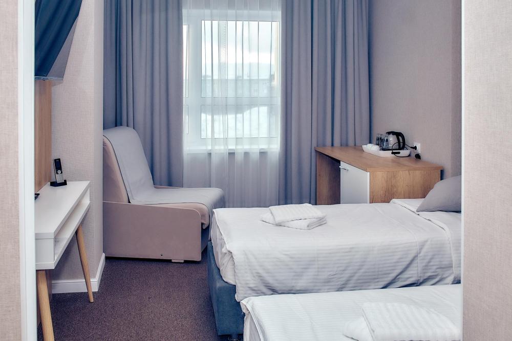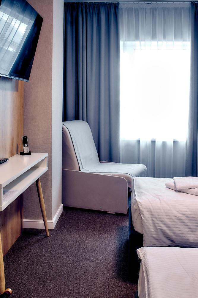 Уютный номер, оборудованный всем необходимым для комфортного проживания. В номере: две односпальные кровати, при необходимости объединяются в двуспальную, раскладной диван, прикроватные тумбочки, телефон, телевизор, санузел с душем.