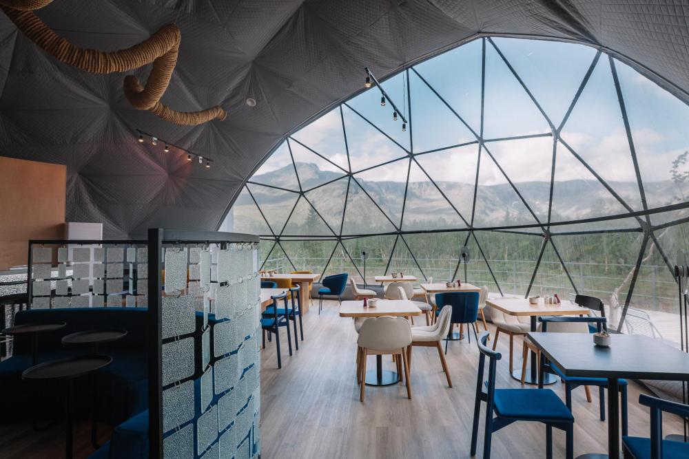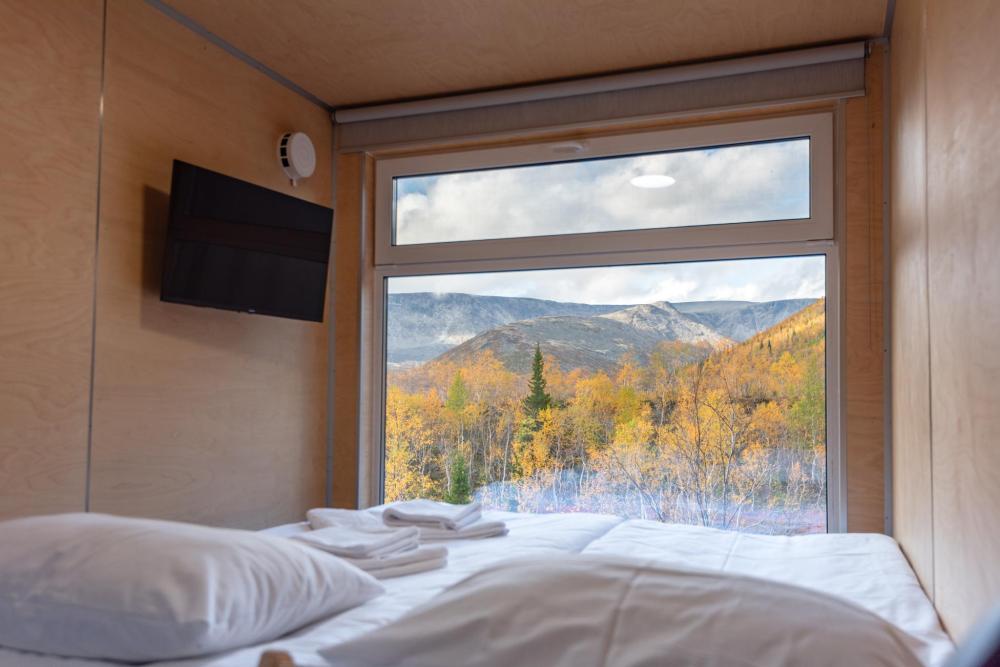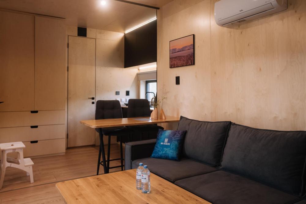 Двухкомнатный номер, площадью 25м2 с отдельной спальней и гостиной. Из панорамного окна в спальне открывается вид на горы.