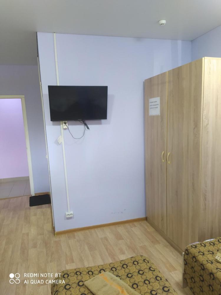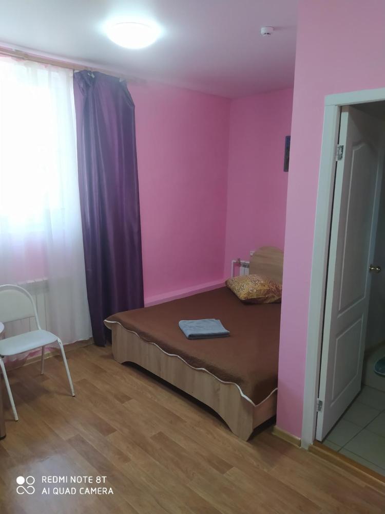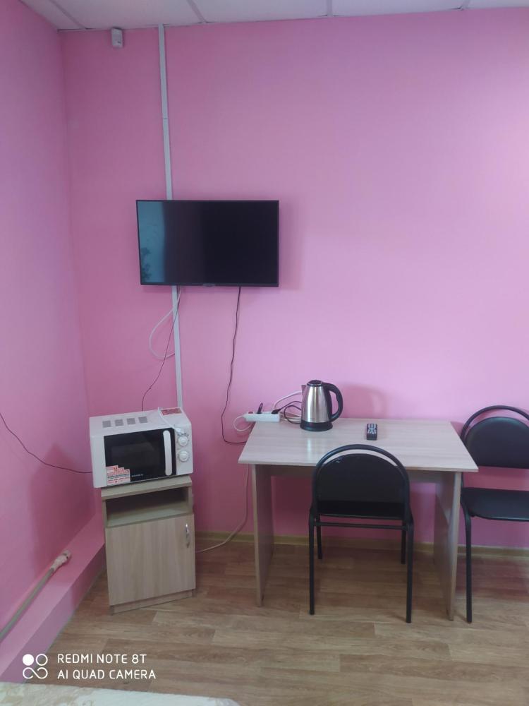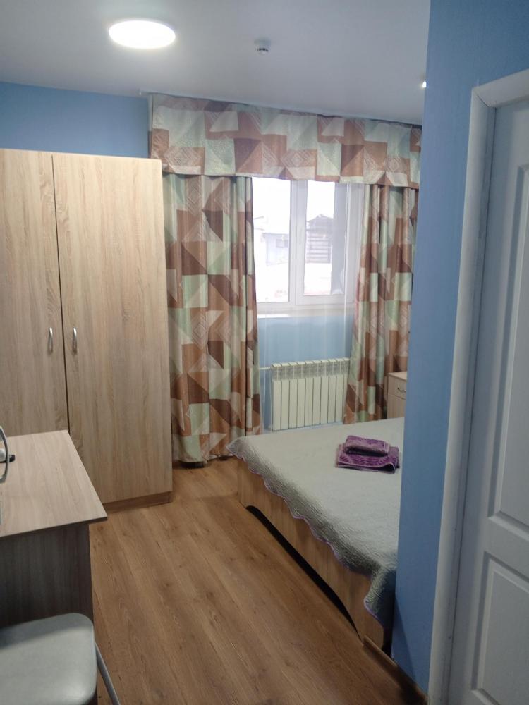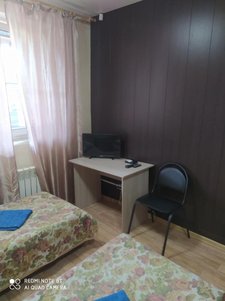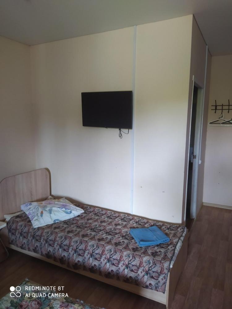 Однокомнатный номер с двухспальной кроватью. Мебель: стул, стулья, стенка, шкаф, тумбочки. Телевизор, холодильник, чайник, микроволновая печь. Туалет с душем в номере.