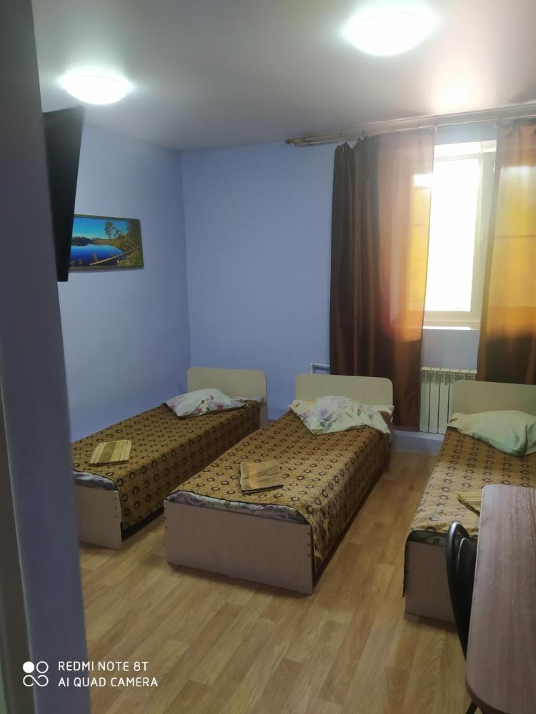 Однокомнатный трехместный номер с 3 односпальными кроватями, стол, стулья, шкаф, телевизор, туалетная комната (раковина, душ, туалет)