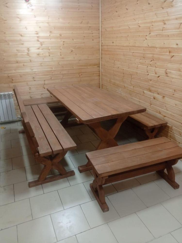 Номер состоит из 2 комнат и имеет отдельный вход с улицы. Комната-спальня: кровать, тумбочка. Комната отдыха - стол с скамьями, телевизор, микроволновая печь, телевизор, холодильник.