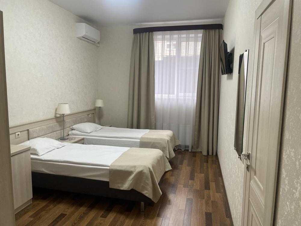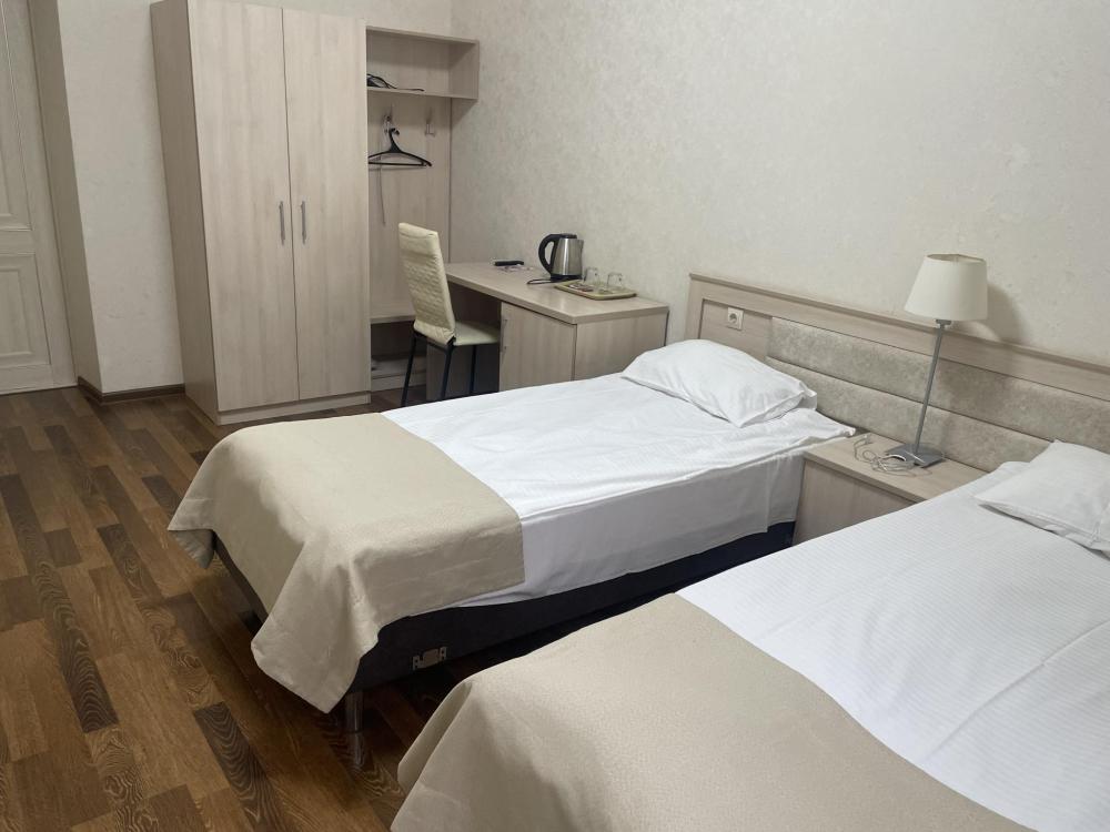 Отличие номера" эконом" от "стандарта" заключается в том, что номера "эконом" находятся на 1 этаже. размер и оснащения данных номеров полностью идентично с категорий "стандарт". В номере: большая двуспальная кровать или две односпальные, дополнительная детская кровать по запросу, шкаф, письменный стол и стулья. В номере имеется чайник, чашки, чай, кофе, сахар и холодильник, а также ТВ 20 каналов и индивидуальный кондиционер. В санузлах: полотенца, тапочки, одноразовые гели и шампуни.