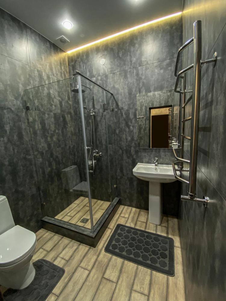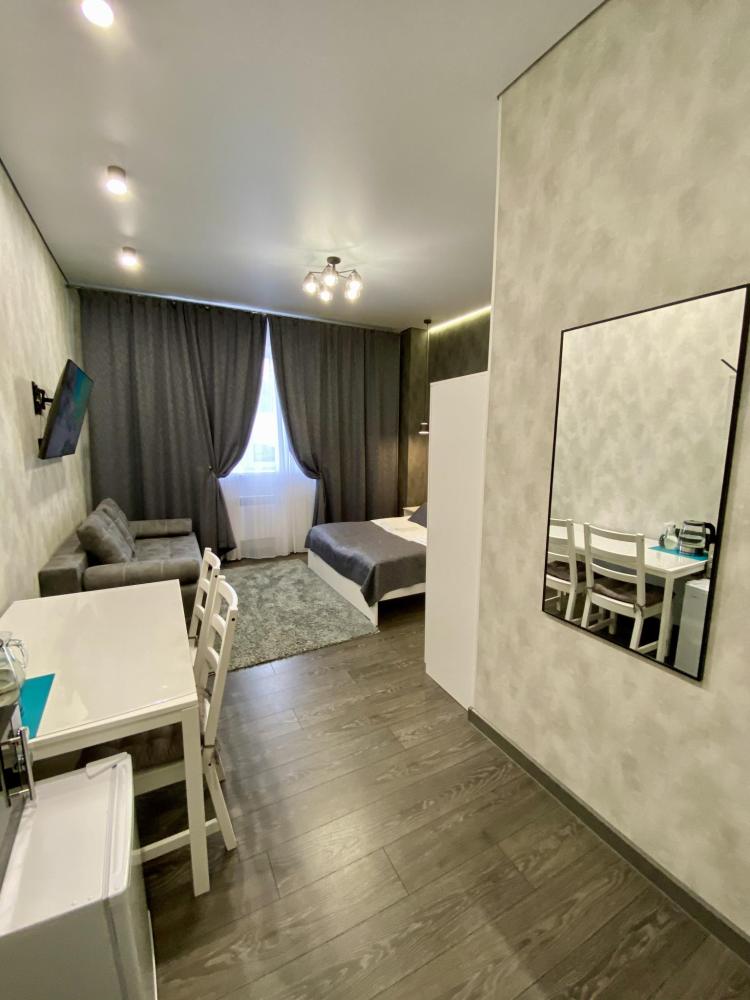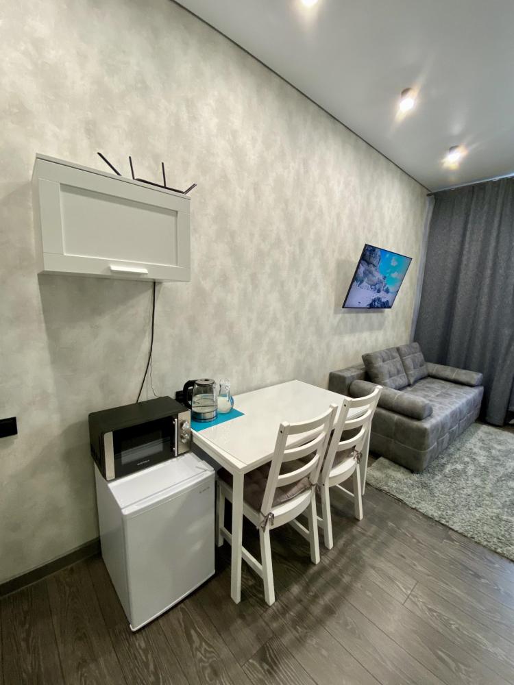 Трехместный номер номер "Лофт однокомнатный" оснащен двухспальной кроватью, раскладным диваном, при необходимости детской кроваткой, собственной душевой комнатой и туалетом, телевизором 50 дюймов, холодильником, микроволновкой, общей кухней со всеми кухонными принадлежностями, бесплатный Wi-Fi, еще есть камин и терраса во дворе и бесплатная парковка.