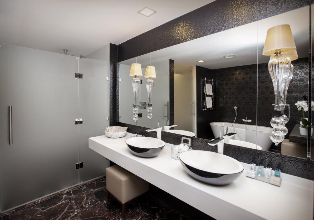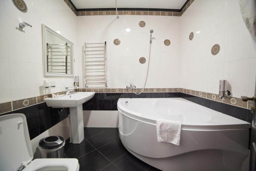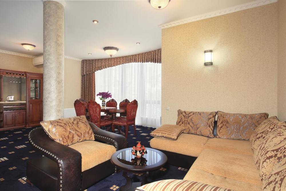 Двуспальная кровать, диван-кровать, стол, стулья, прикроватные тумбочки, туалетный столик, журнальный столик кресло, шкафы , кондиционер, журнальный столик, телевизор, чайник, холодильник. В номере два санузла: ванна, туалет, раковина, душевая кабина, фен, зеркало. Wi-fi TV 20 каналов Smart TV Внутренний телефон Сейф Кондиционер