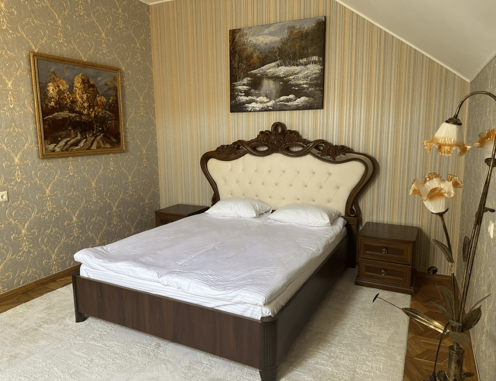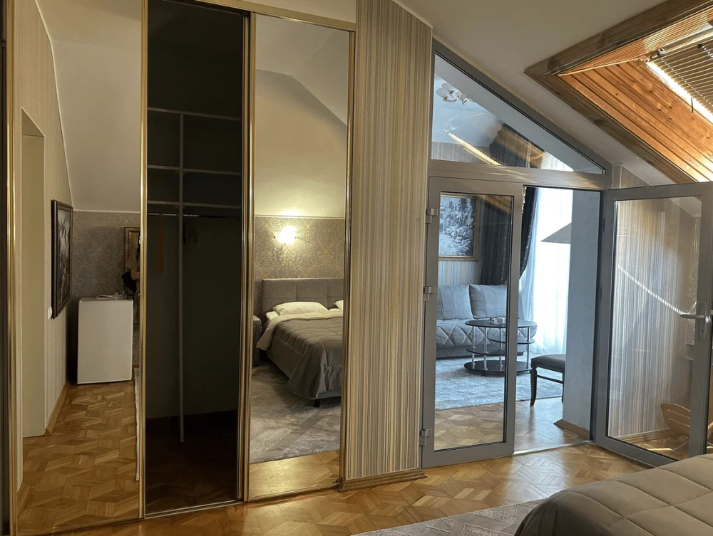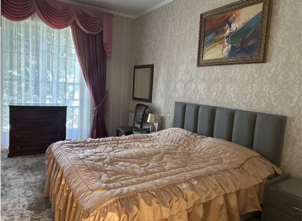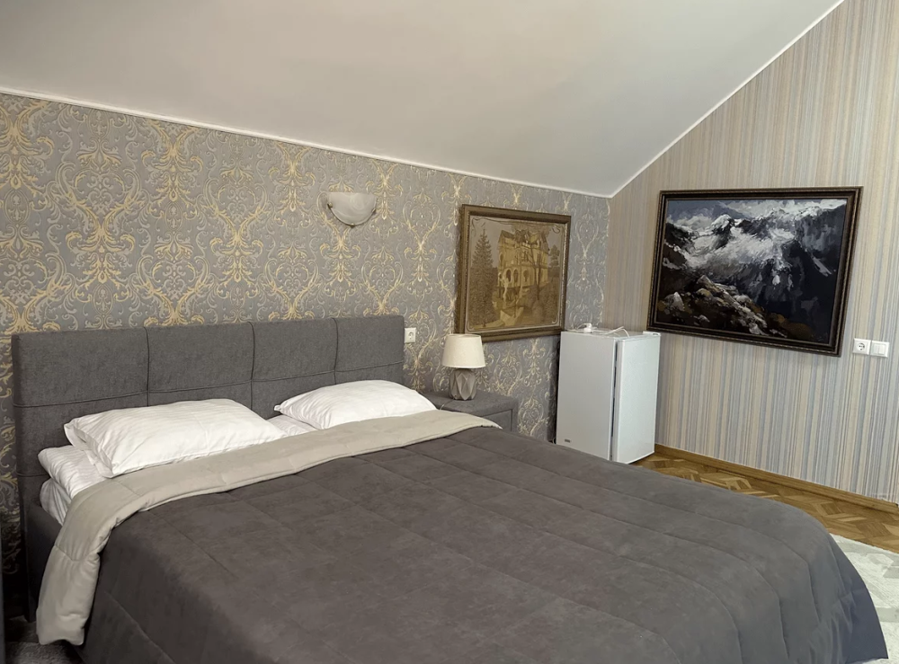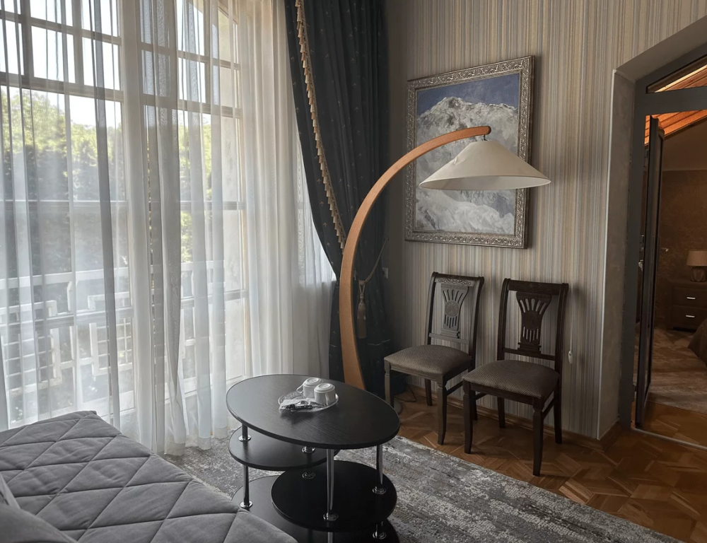 Номер находится в гостевом доме, расположенном в курортной зоне на территории усадьбы балерины Матильды Кшесинской, в 300 метрах от входа в Национальный парк Кисловодский и в шаговой доступности от нарзанного бювета. В номере: две спальни с кроватью «King size» с ортопедическим матрасом. Гостиная зона: раскладной диван двуспальный, телевизор SmartTV, мини-холодильник, сейф, балкон. Ванная комната: душевая кабина, туалет с гигиеническим душем, раковина со столешницей и зеркалом, банные халаты и тапочки для гостей, туалетные принадлежности.