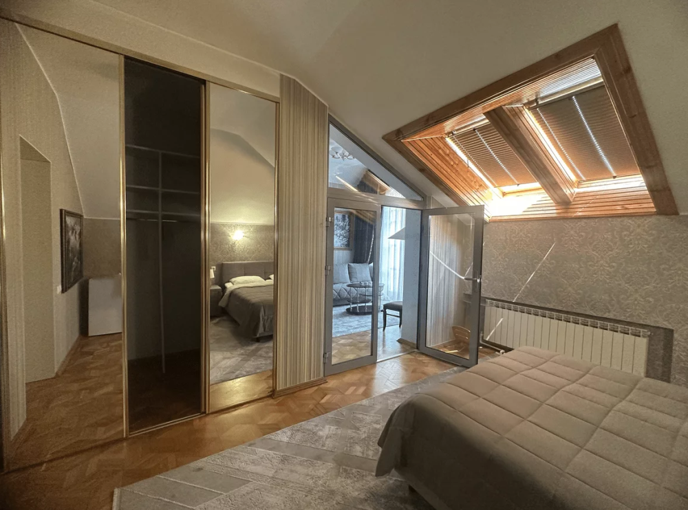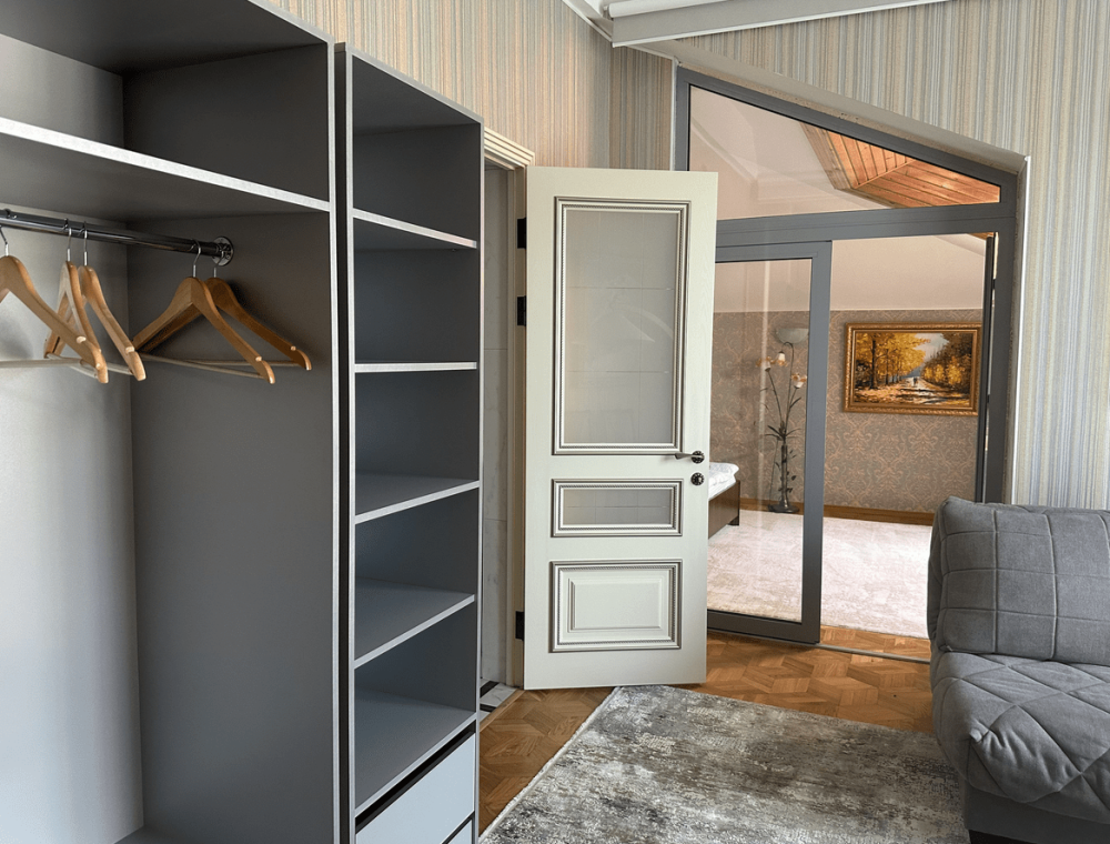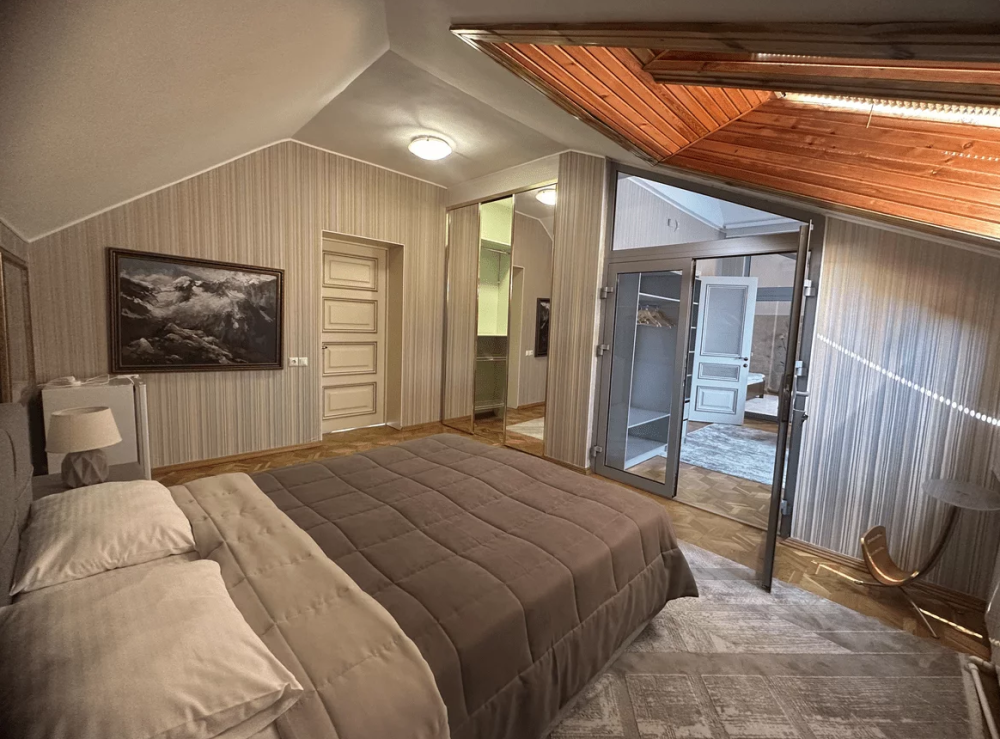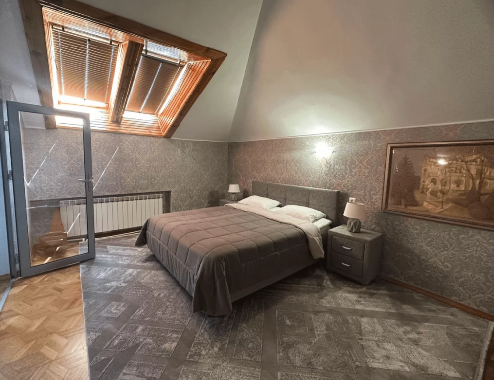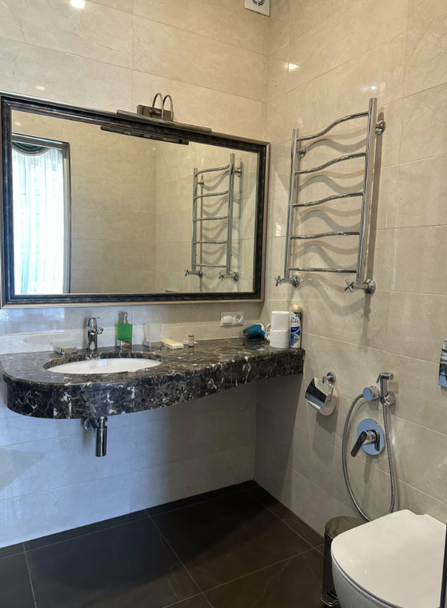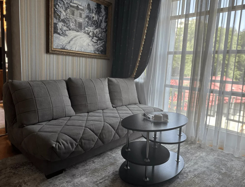 Номер находится в гостевом доме, расположенном в курортной зоне на территории усадьбы балерины Матильды Кшесинской, в 300 метрах от входа в Национальный парк Кисловодский и в шаговой доступности от нарзанного бювета. В номере: две спальни с кроватью «King size» с ортопедическим матрасом. Гостиная зона: раскладной диван двуспальный, телевизор SmartTV, мини-холодильник, сейф, балкон. Ванная комната: душевая кабина, туалет с гигиеническим душем, раковина со столешницей и зеркалом, банные халаты и тапочки для гостей, туалетные принадлежности.