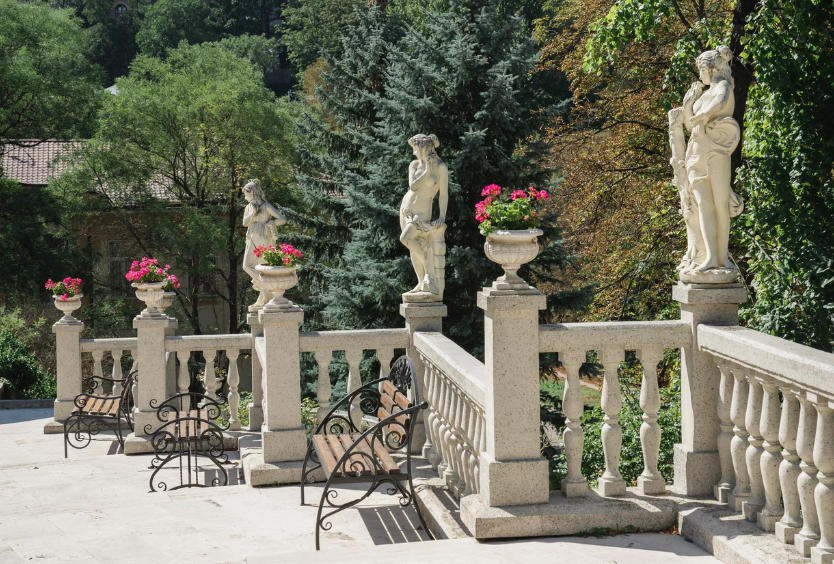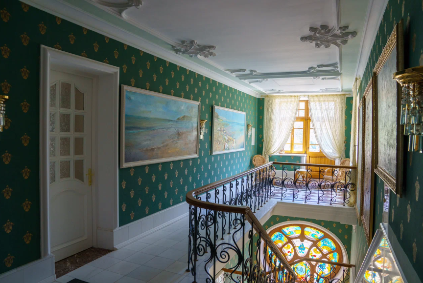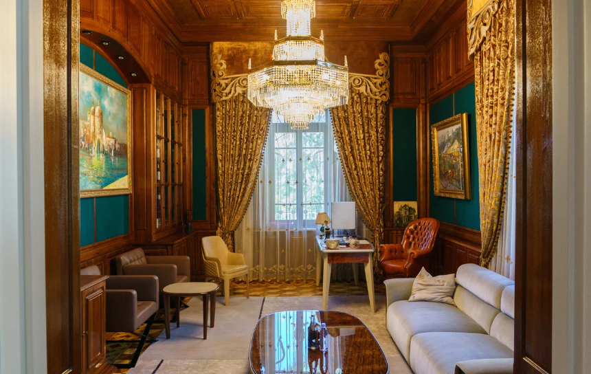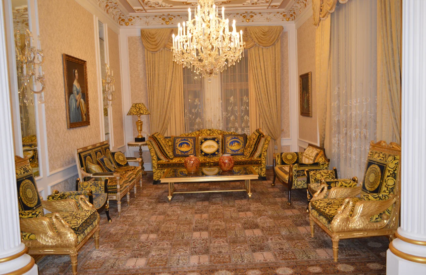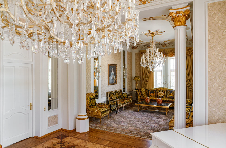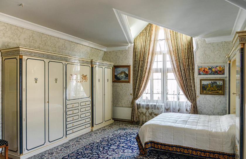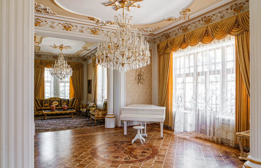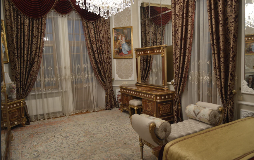 Усадьба балерины Матильды Кшесинкой, общей площадью 884,8 м2, 10 спален, 8 санузлов, джакузи, бассейн (крытый и открытый), кухня, столовая и спорт зал. Оснащение: видео/аудио - кабельное телевидение, телевизор; электроника - духовка, кофемашина, мини-холодильник, светильник, система безопасности, утюг, фен, холодильник; ванная комната - банные полотенца, ванная комната, ванная с джакузи, гигиенический душ, джакузи, сауна, тапочки, туалет, туалетные средства; внешняя территория и вид из окон - балкон, балкон с красивым видом, вид на бассейн, вид на город, вид на парк, терраса; интернет/телефония - Wi-Fi, интернет; мебель - гардеробная, кровати «King size», зеркало, обеденный стол, письменный стол, стол, стулья, эксклюзивная мебель, антикварная мебель, ковер, чайник.