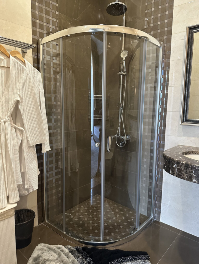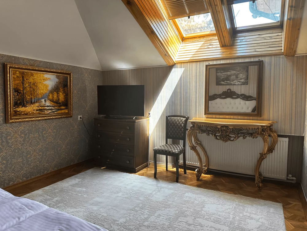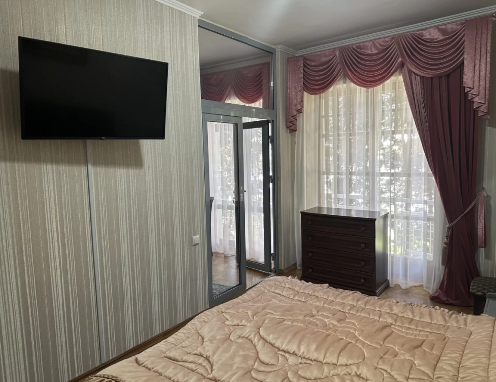 Номер находится в гостевом доме, расположенном в курортной зоне на территории усадьбы балерины Матильды Кшесинской, в 300 метрах от входа в Национальный парк Кисловодский и в шаговой доступности от нарзанного бювета. В номере: две спальни с кроватью «King size» с ортопедическим матрасом. Гостиная зона: дополнительная односпальная кровать, телевизор SmartTV, мини-холодильник, балкон. Ванная комната: душевая кабина, туалет с гигиеническим душем, раковина со столешницей и зеркалом, банные халаты и тапочки для гостей, туалетные принадлежности.