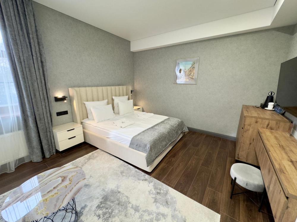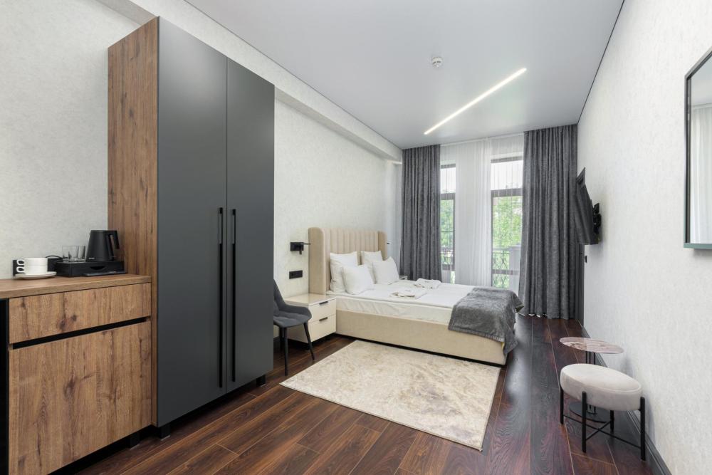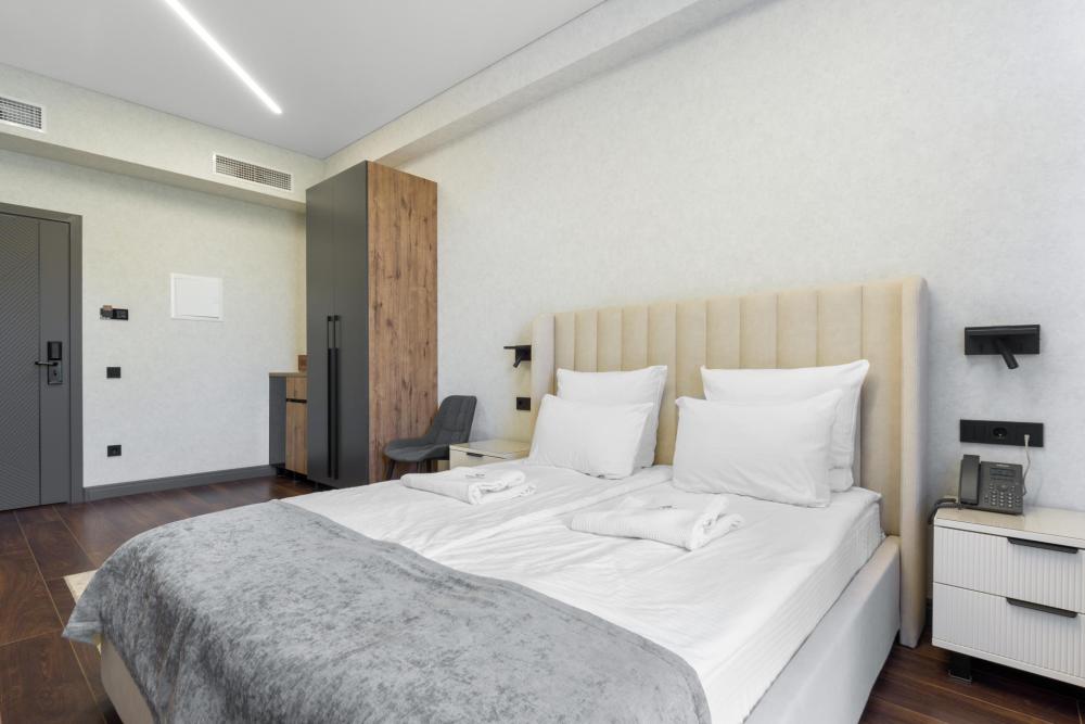 Однокомнатный номер категории стандарт, дизайнерский интерьер и современное оснащение, двухспальная кровать с мягким изголовьем, беспроводная зарядка для телефонов, чайная станция и телевизор со Smart TV. Хорошая звукоизоляция и система кондиционирования воздуха.