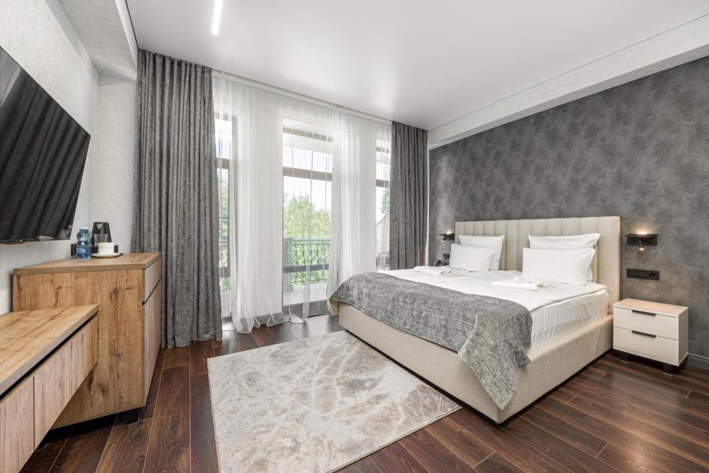 Номер повышенной комфортности, дизайнерский интерьер, современное оснащение, зонирование номера, кровать с мягким изголовьем и раскладной диван, чайная станция, два телевизора со Smart TV, беспроводная зарядка, халаты, тапочки и косметические средства в ванной комнате. Хорошая звукоизоляция и система кондиционирования воздуха.