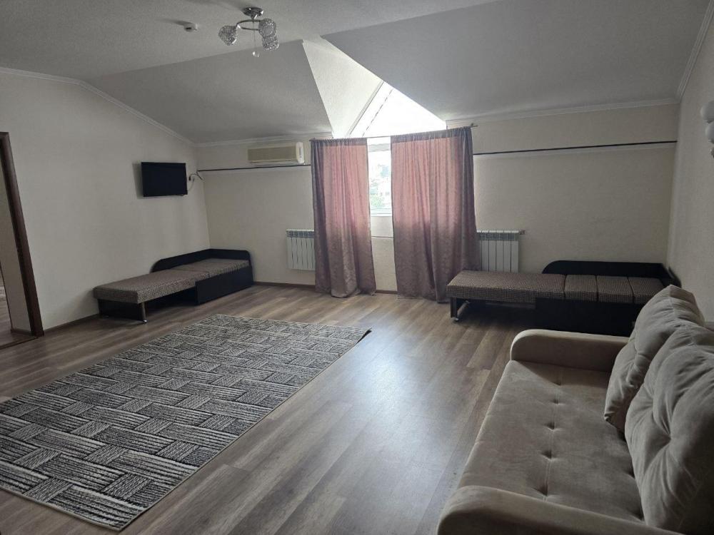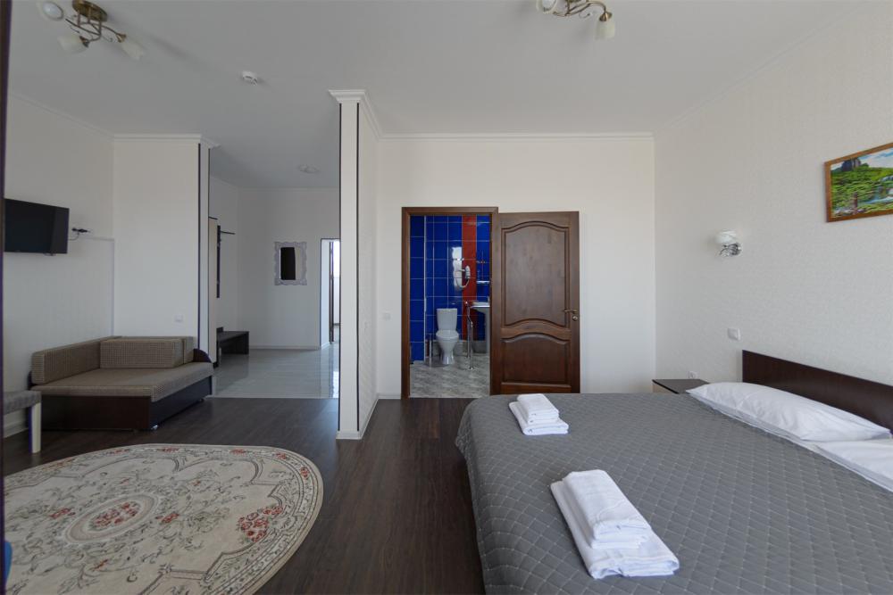 Просторный номер из двух комнат c большой ванной комнатой, располагающий к отдыху интерьер , большая кровать, три дивана кровати ( одноместное размещение). Для вашего комфорта предусмотрена дополнительная мебель : небольшой столик и стулья для вашего уюта, сюда будет приятно возвращаться после прогулок. Wi-fi, кондиционер. Максимальное размещение 5 гостей.