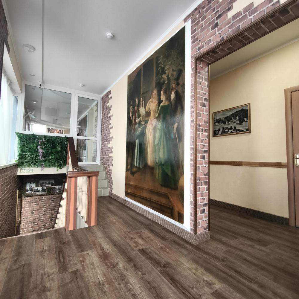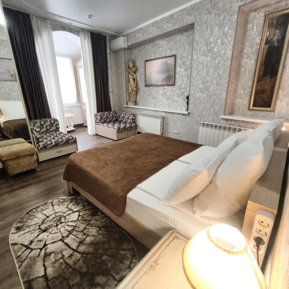 Совмещенный санузел с ванной, фен, гигиенические средства, косметические средства, полотенца, халат, тапочки; сушилка для белья). В номере кровати системы трансформер (TWIN/DBL), ортопедический матрас, мягкая мебель, ТВ, мини-холодильник, КД, сейф,Wi-Fi, чайник, чашки, чай и кофе, питьевая вода. Французский балкон с панорамным видом на город и горы. Доп. место – раскладывающееся кресло. Номера расположены в основном корпусе в самом центре города-курорта Кисловодска.