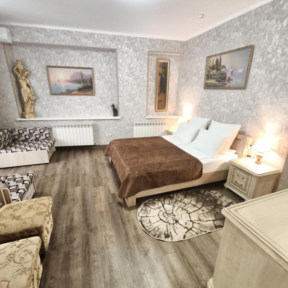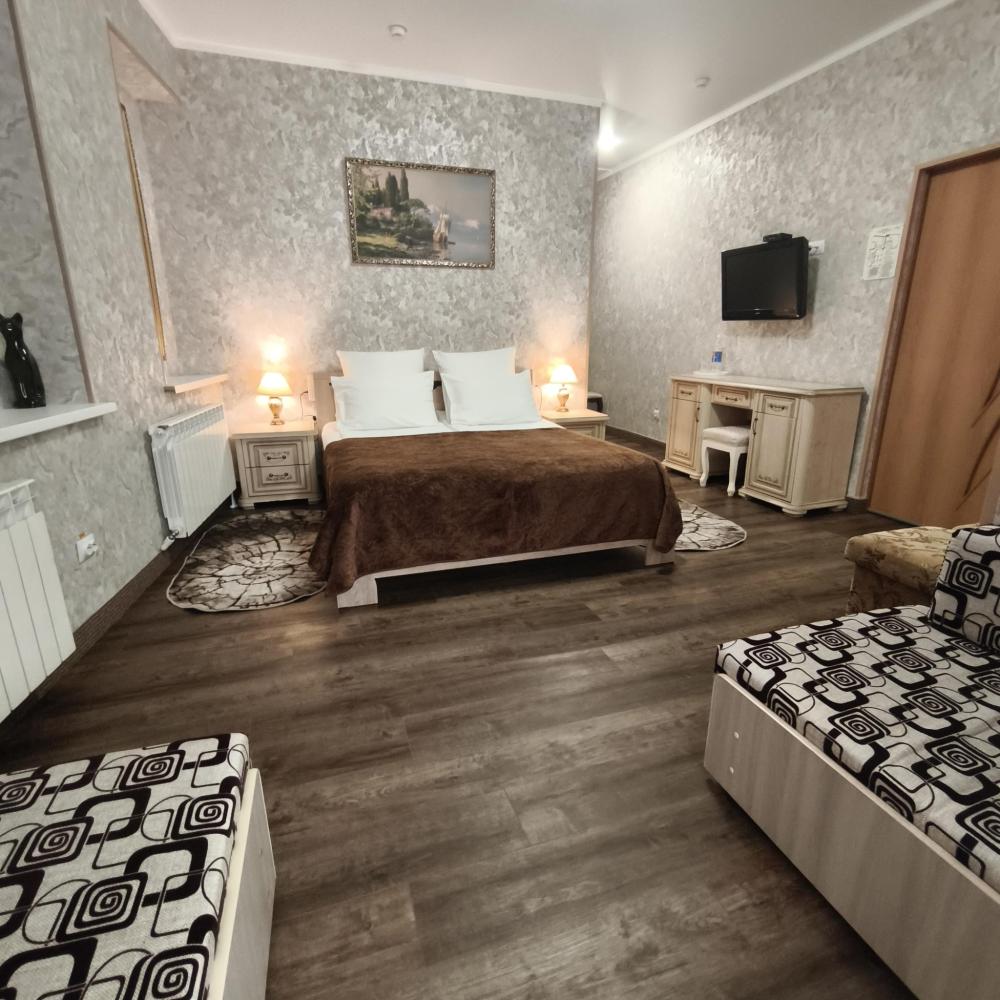 Совмещенный санузел с ванной, фен, гигиенические средства, косметические средства, полотенца, халат, тапочки; сушилка для белья). В номере кровати системы трансформер (TWIN/DBL), ортопедический матрас, мягкая мебель, ТВ, мини-холодильник, КД, сейф,Wi-Fi, чайник, чашки, чай и кофе, питьевая вода. Балкон с видом на город. Доп. место – раскладывающееся кресло. Номера расположены в основном корпусе в самом центре города-курорта Кисловодска.