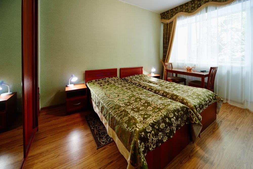 Уютный однокомнатный номер. Вместимость номера до трех человек (2 основных места + 1 дополнительное место). В номере : 2 кровати одноместные, фен, сейф, сушилка для одежды, телевизор, холодильник