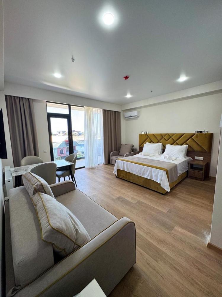 Апартаменты с диваном, номер площадью 35 кв.м с видом на бассейн. Подходит для размещения 5 человек. (2 основных места и 3 дополнительных) Имеет спальню с приятным интерьером. В номере: 1 двуспальная кровать, 1 двуспальный диван, 1 софа односпальная. Имеется телевизор, кондиционер, шкаф, вешалка, зеркало, обеденный стол, рабочий стол, холодильник, стулья, кухня, чайник, электрическая плита, стиральная машинка и сушилка для белья. Индивидуальная ванная комната: душ, раковина, туалет. В стоимость входит: Постельное бельё, полотенца, мыло.
