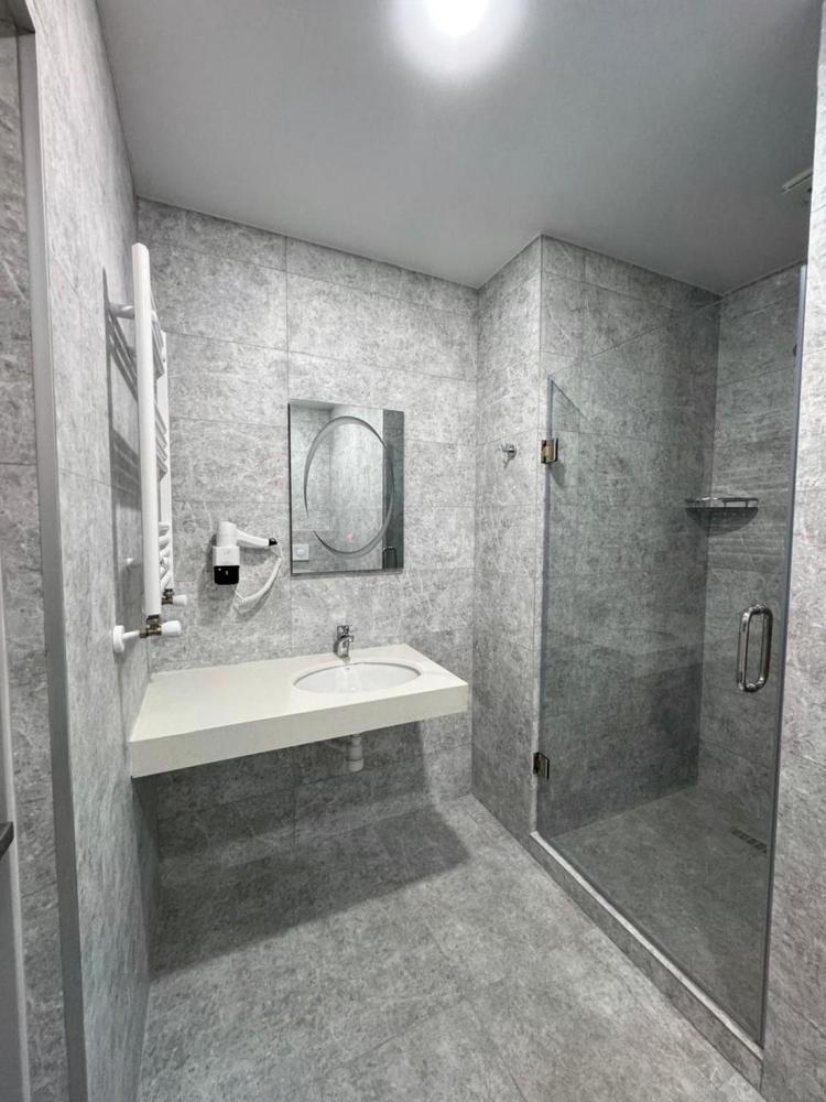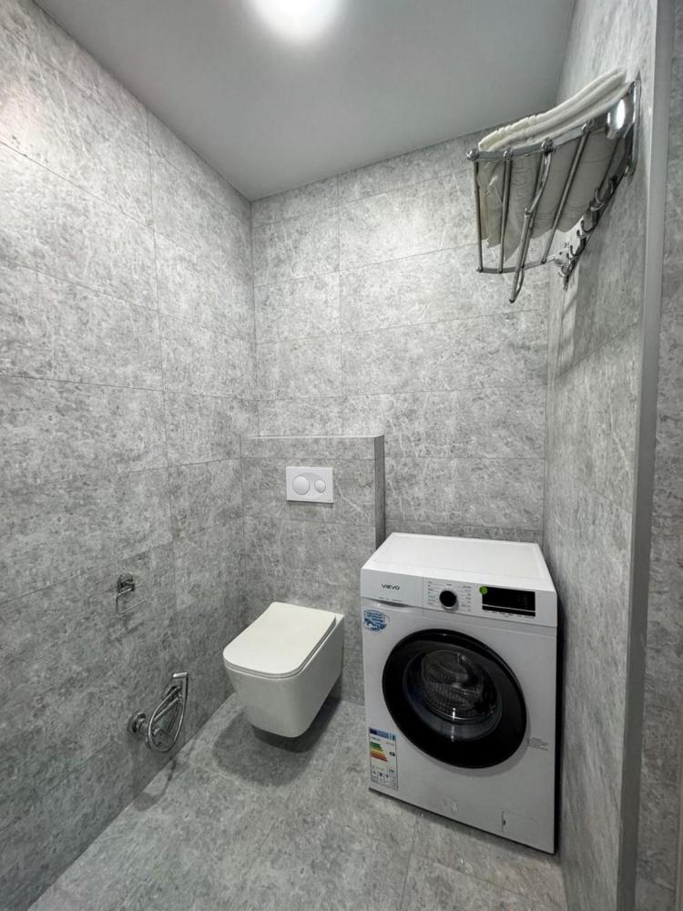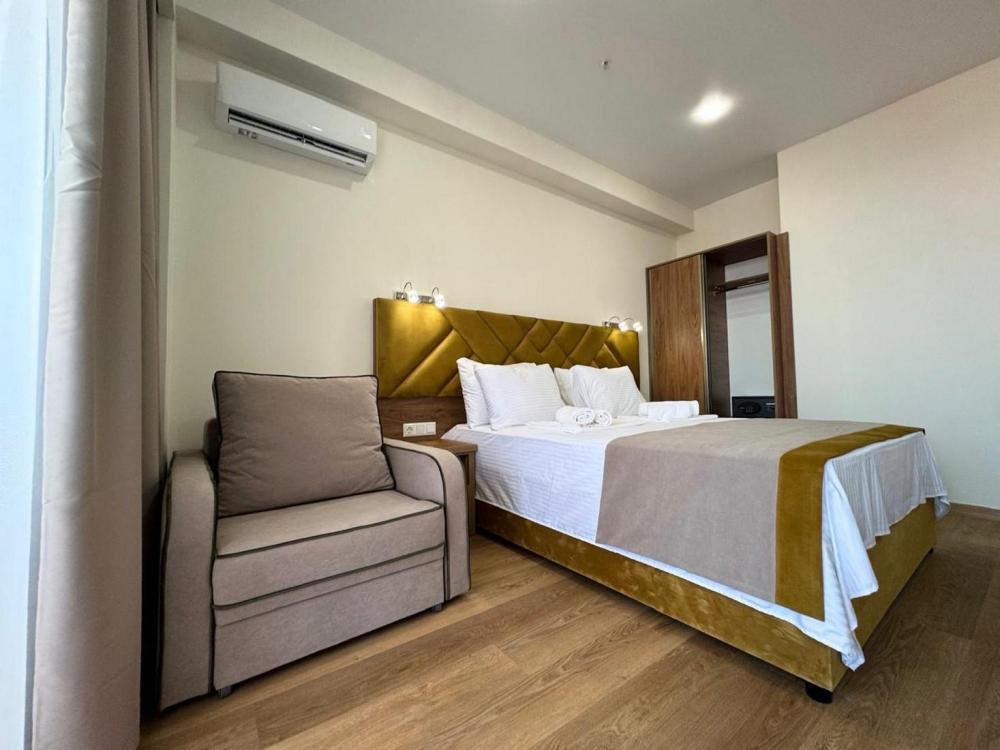 Апартаменты с креслом, номер площадью 38 кв.м с видом на улицу. Подходит для размещения 3 человек. (2 основных места и 1 дополнительное) Имеет спальню с приятным интерьером. В номере: 1 двуспальная кровать, 1 кресло-кровать. Имеется телевизор, кондиционер, шкаф, вешалка, зеркало, обеденный стол, рабочий стол, холодильник, стулья, кухня, чайник, электрическая плита, стиральная машинка и сушилка для белья. Индивидуальная ванная комната: душ, раковина, туалет. В стоимость входит: Постельное бельё, полотенца, мыло.