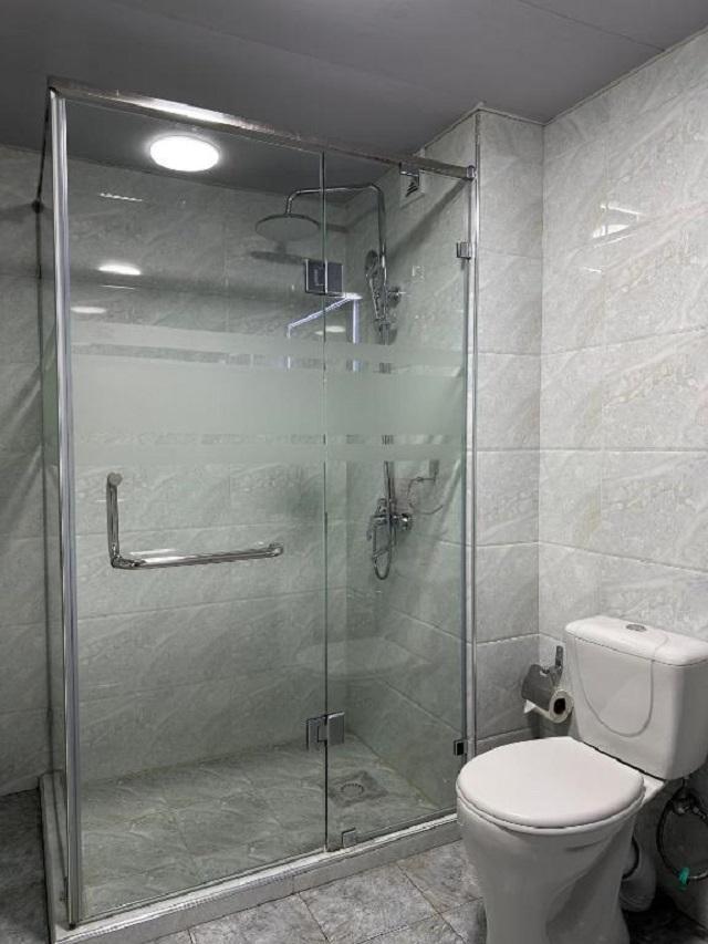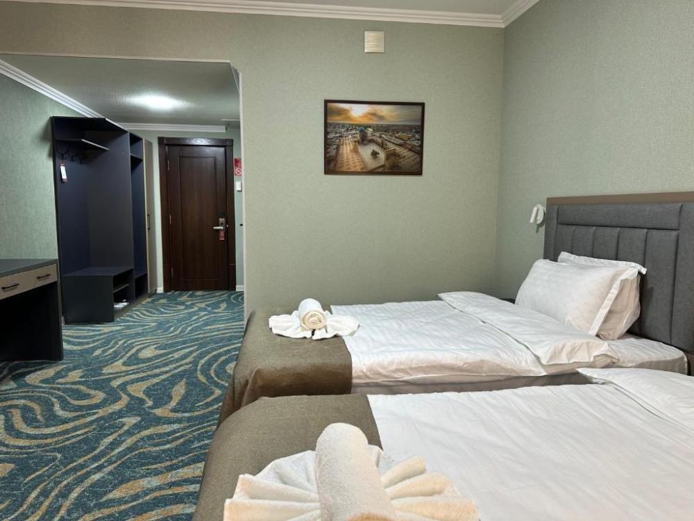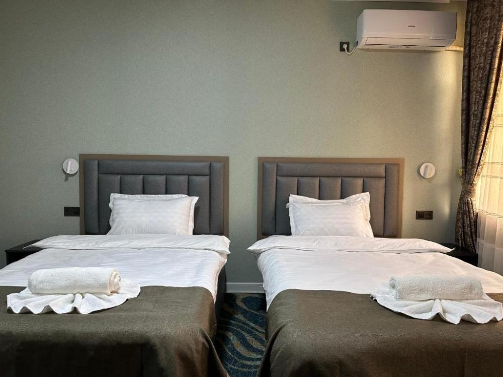 Номер с двумя кроватями и душевой кабиной. Также в номере есть шкаф, письменный стол, телефон, кондиционер, фен, холодильник, электрочайник, телевизор.