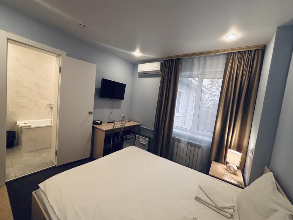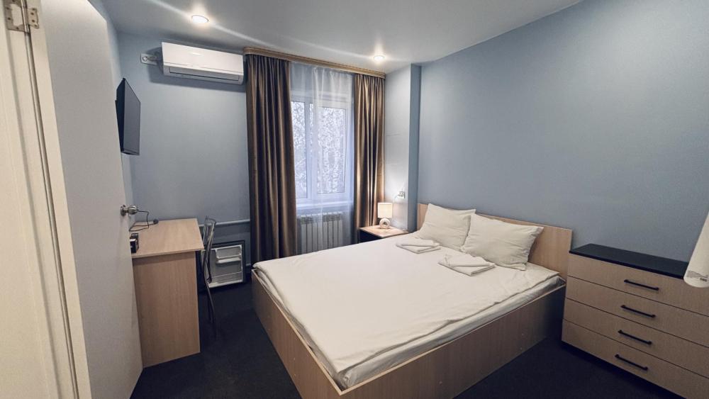 Однокомнатный номер с двуспальной кроватью размером 160*200 и площадью около 20 м2. В номере есть холодильник, плазменный ТВ с функцией Smart, Wi-Fi, бутилированная вода, чай/кофе, чайник. В ванной комнате установлена душевая кабина, имеются средства личной гигиены, фен, тапочки. Установка дополнительного места уточняется у администратора.