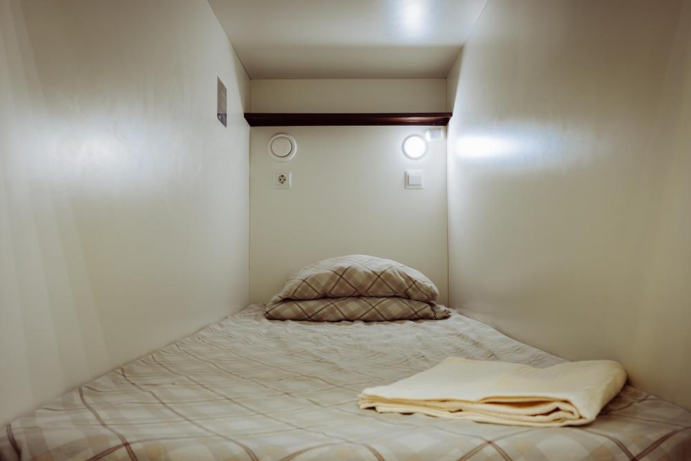 Двухместная капсула с большим матрасом для двух человек. Капсула укомплектована всем необходимым для очень комфортного пребывания: свежее белье, вешалка, розетка, бесплатный интернет, личный свет, шумоизоляция, вентиляция, замки на дверцах, вешалка.