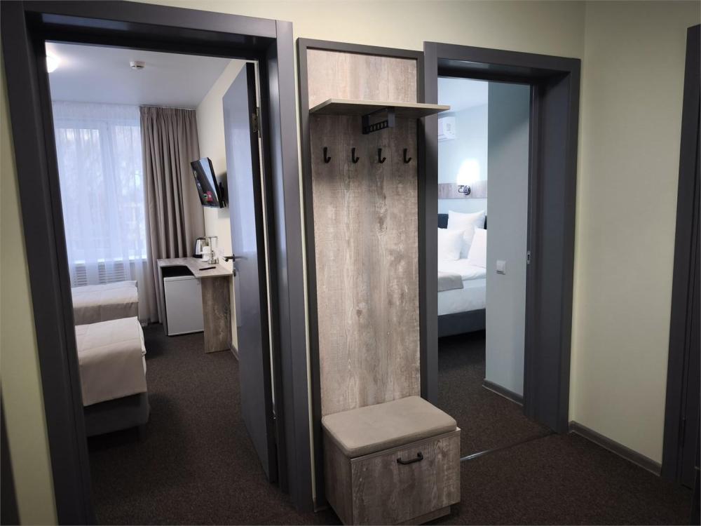 Двухкомнатный (Семейный) номер «Комфорт» в стиле лофт — это гармония стиля, минимализма и функциональности для всей семьи. В номере комфортабельная кровать с матрасом класса «Люкс» высотой 24 см и шириной 160 см в одной комнате, и две одноместные кровати с такими же матрасами в другой. Рабочая зона с удобным вращающимися креслами, эргономичными столами и продуманным освещением для работы и отдыха. Мебель бизнес-класса, оформленная в современных оттенках «бетон пайн», сочетающая функциональность и эстетику. Холодильник в каждой комнате. В данной категории номеров установлен большой шкаф-купе глубиной 80см, позволяющий разместить большое количество вещей в случае длительного проживания или при заселении семьи из 3х – 4х человек, что позволяет комфортно проживать и не загромождать пространство. Вместо ванны современная душевая зона. Технологичное оснащение номера включает высокоскоростной Wi-Fi, два LED-телевизора, холодильник, систему климат-контроля, чайник и чайный набор. Номер идеально подходит тех, кто ценит стиль, функциональность и высокий уровень комфорта.