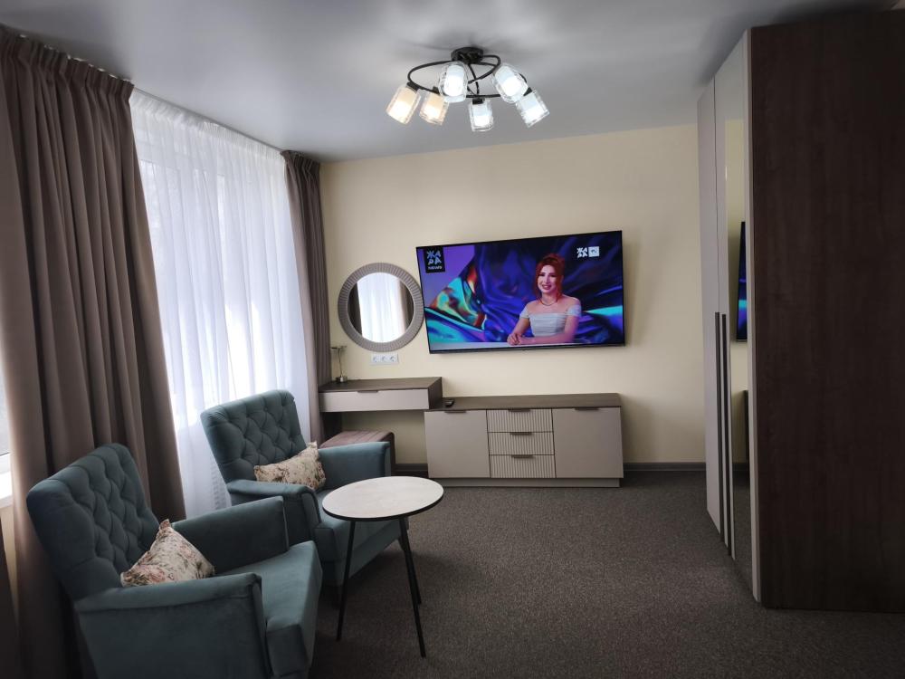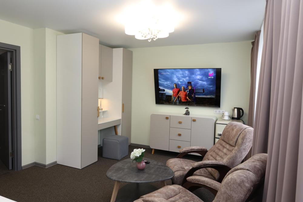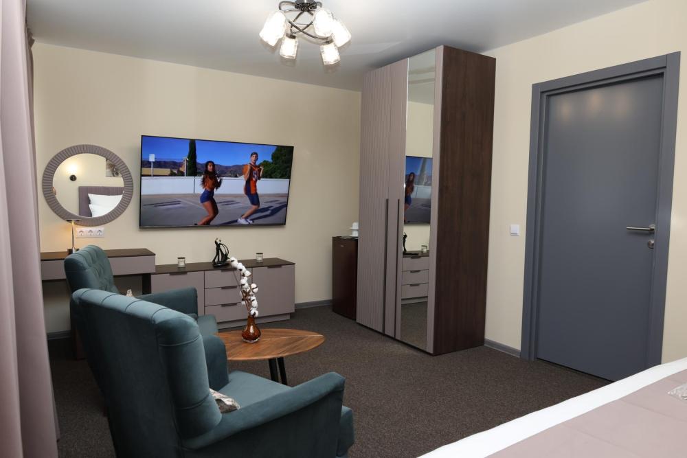 Услуги: Ванна, Телевизор, WI-FI, Кондиционер, Фен, Халат, Холодильник, Бесплатные туалетные принадлежности, Туалет, Ванная комната, Отопление, Тапочки, Ванна или душ, Электрический чайник, Шкаф/гардероб, Полотенца, Белье. Описание: Люкс с гостиной и спальней, где есть большая кровать или 2 раздельные, кондиционер, телевизор, холодильник и собственная ванная комната.