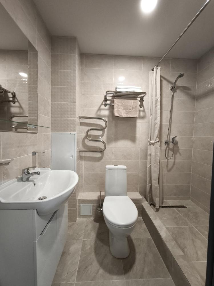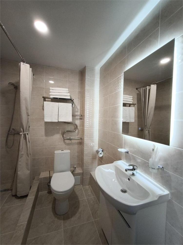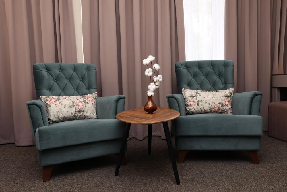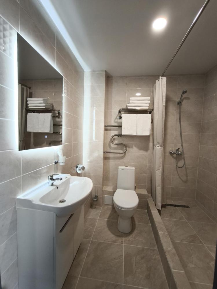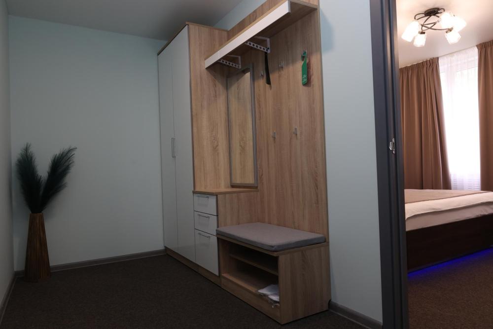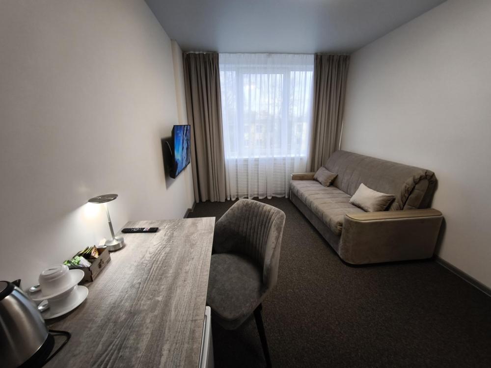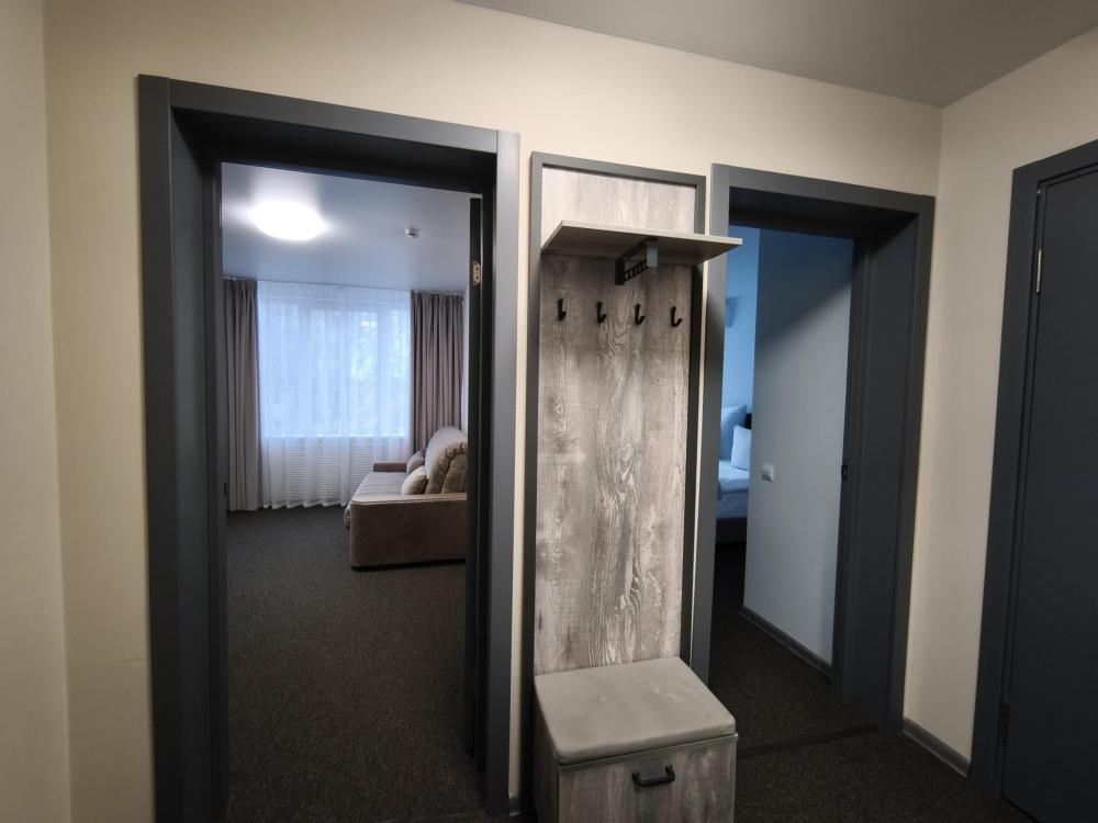 Двухкомнатный номер «Комфорт» в стиле лофт — это гармония стиля, минимализма и функциональности. В номере комфортабельная кровать с матрасом класса «Люкс» высотой 24 см и шириной 160 см или две одноместные кровати. В гостевой комнате расположен комфортабельный диван с журнальным столиком, телевизор 50", а также отдельная рабочая зона с удобным вращающимся креслом и продуманным освещением для работы и отдыха. Мебель бизнес-класса, оформленная в современных оттенках «бетон пайн», сочетающая функциональность и эстетику. В данной категории номеров установлен большой шкаф-купе глубиной 80см, позволяющий разместить большое количество вещей в случае длительного проживания или при заселении семьи из 3х – 4х человек, что позволяет комфортно проживать и не загромождать пространство. Вместо ванны современная душевая зона. Технологичное оснащение номера включает высокоскоростной Wi-Fi, два LED-телевизора, холодильник, систему климат-контроля, чайник и чайный набор. Номер идеально подходит тех, кто ценит стиль, функциональность и высокий уровень комфорта.