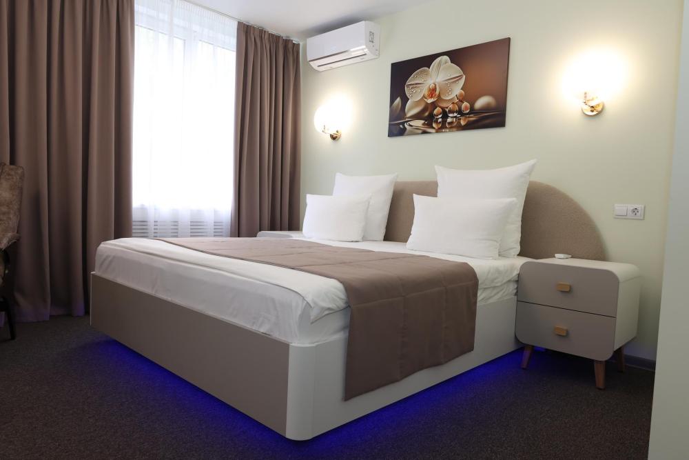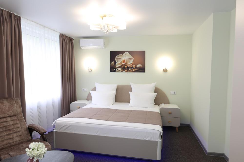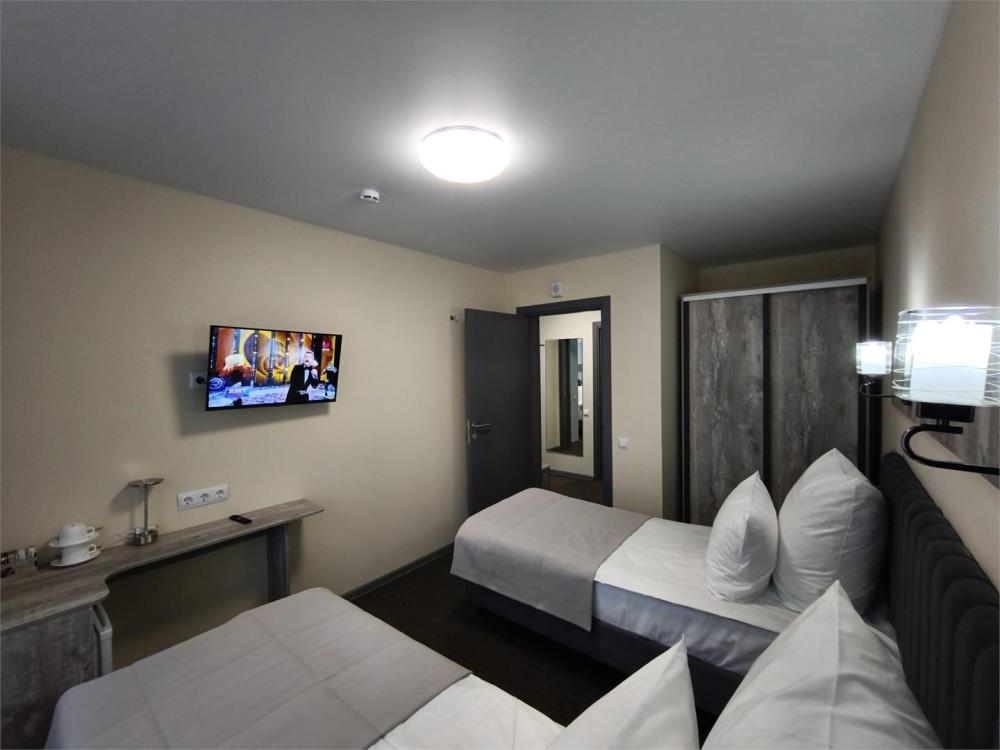 В номере установлена просторная двуспальная кровать с матрасом класса «Люкс», высотой 24 см и шириной 160см. или две отдельные кровати. Матрасы обеспечивают идеальный баланс поддержки и мягкости для полноценного сна. Интерьер из мебели бизнес-класса с эргономичным рабочим столом, удобным креслом и акцентным освещением, создающим комфортную атмосферу как для работы, так и для отдыха. Вместо ванны — современная душевая зона. Современное оснащение номера включает высокоскоростной Wi-Fi, LED-телевизор и систему климат-контроля для поддержания идеальной температуры, а также беспроводную настольную лампу, холодильник, чайник и чайный набор.