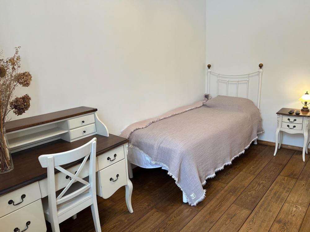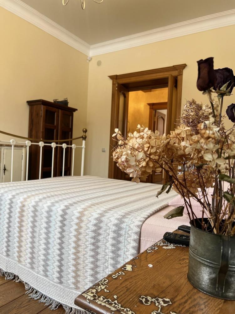 Сердцем квартиры является просторная спальня. Большая удобная кровать, премиальное постельное бельё, мягкий текстиль и приглушённый свет создают атмосферу уюта и романтики, сравнимую с небольшими бутик-отелями Италии или Франции. Здесь легко расслабиться, почувствовать себя в безопасности и насладиться тишиной и уединением.
