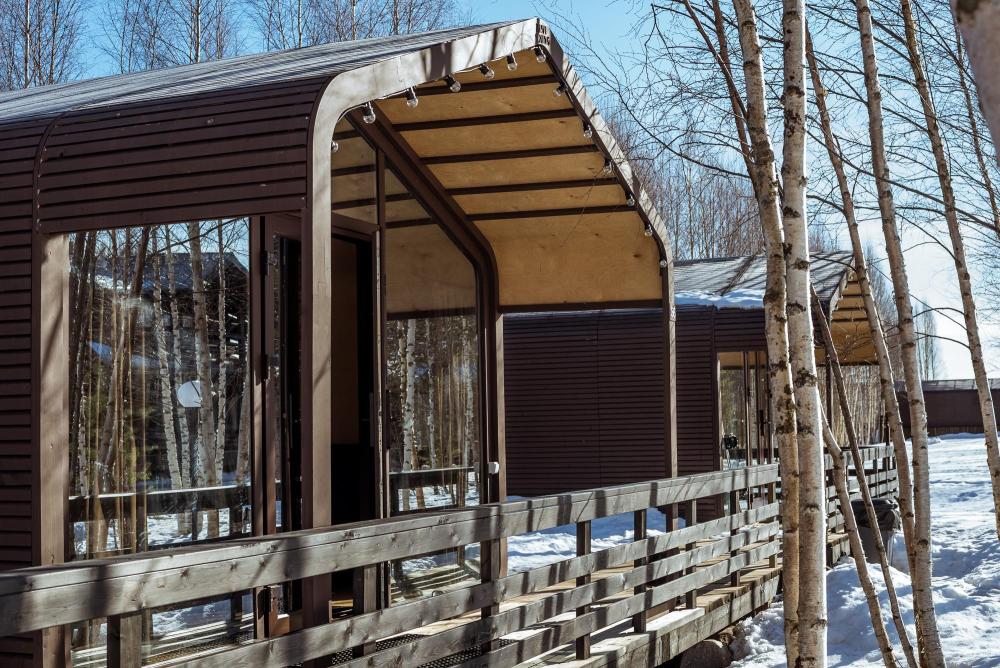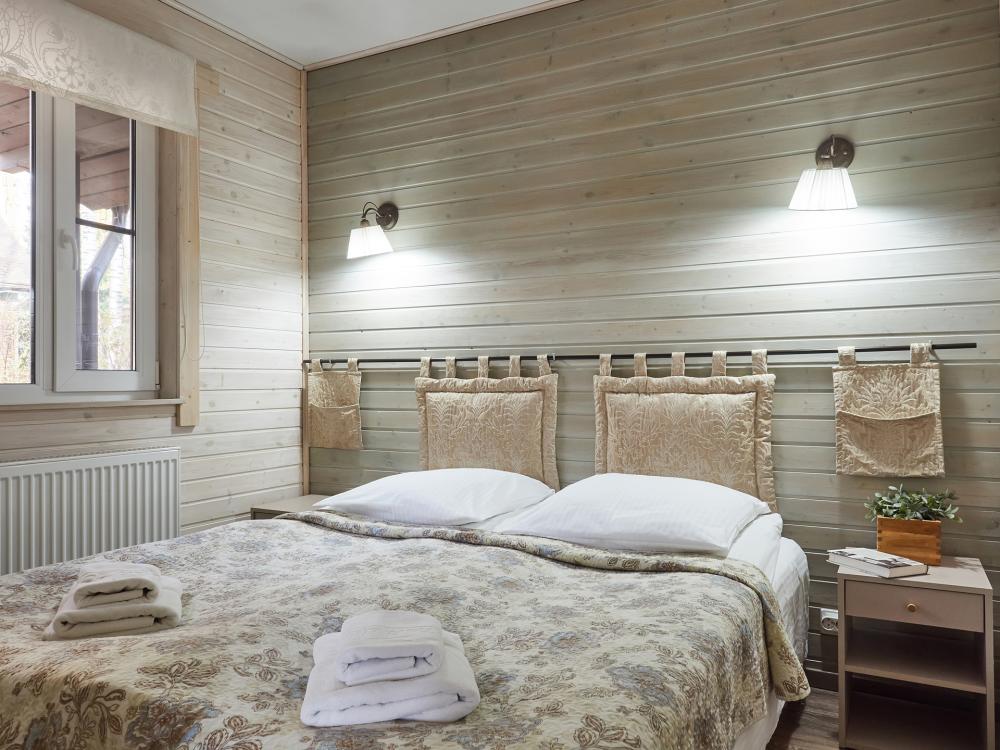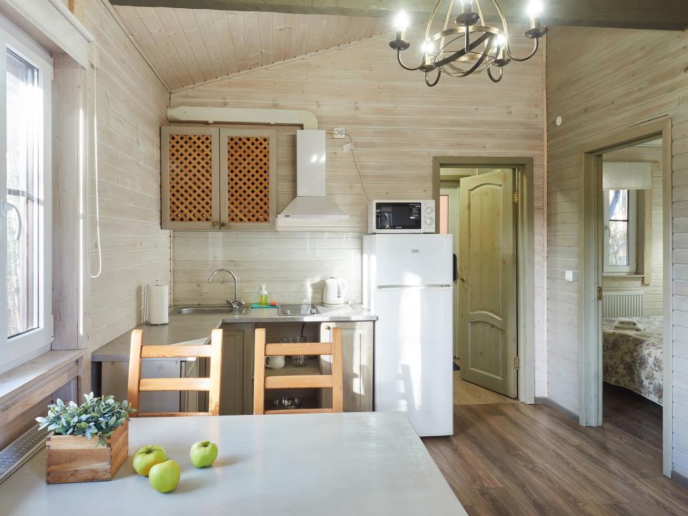 ютные деревянные одноэтажные коттеджи финского типа, постройки 2012 г. с террасой. Коттедж, общей площадью 48 кв. м. (две спальни и кухня – гостиная), рассчитан на комфортный семейный отдых 4-6 человек. Во внутреннем дворике мангал. Услуги и удобства: оборудованная кухня – гостиная, холодильник, эл. плита, микроволновая печь, эл. чайник, ЖК телевизор, стиральная машина (по запросу), душ, туалет с теплым полом, постельное белье, полотенца, гигиеническая продукция. Размер кровати: 4 односпальные кровати + 2 доп. места в гостиной на раскладывающемся диване.