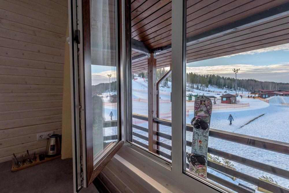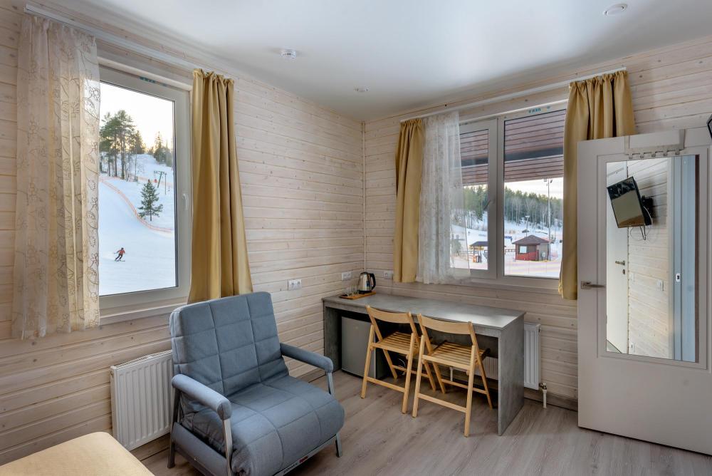 Номер в Спорт Отеле (нижний парк "Золотой Долины", 30 метров до подъемника). Однокомнатный двухместный номер с отдельным входом через террасу. Вид на горнолыжный склон. Ski inn/ski-out. В номере две кровати, сдвигающиеся в одну большую. Допускается проживание с животными (за доп.плату).