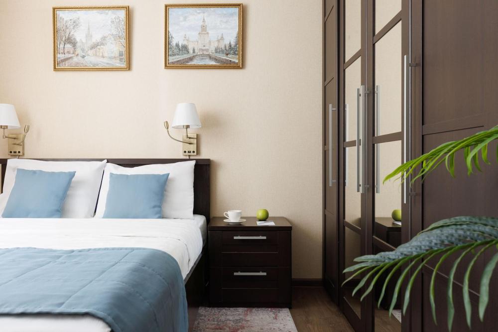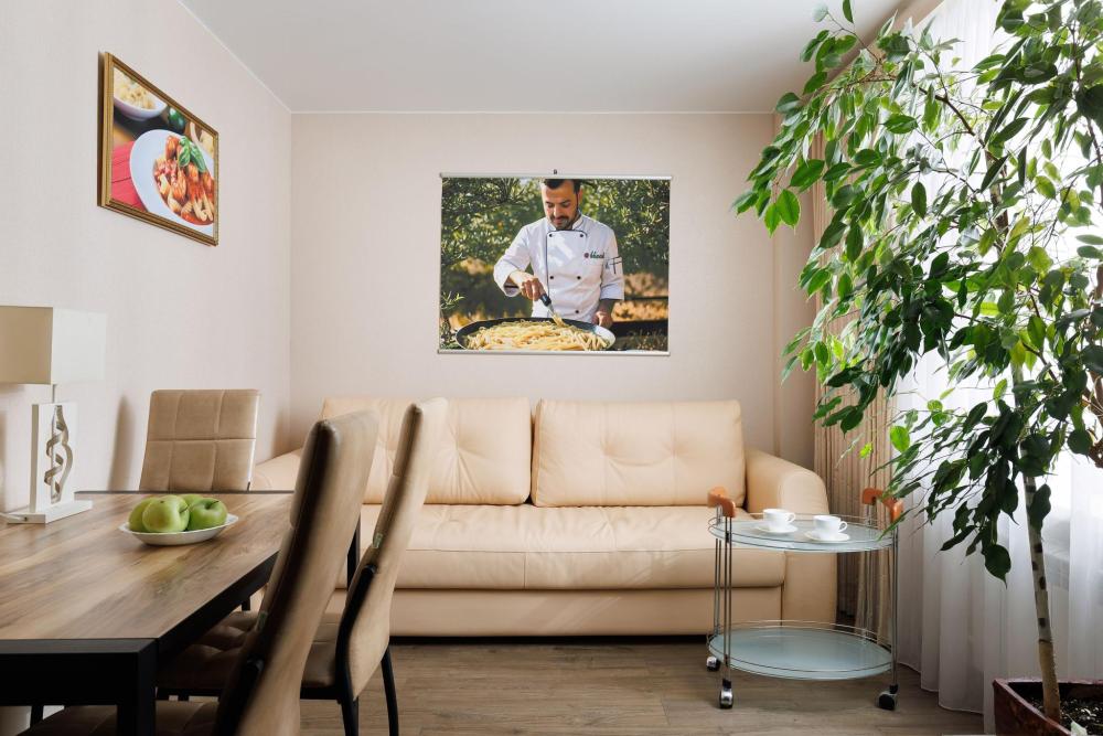Двухкомнатные апартаменты с полностью оборудованной кухней, чайная станция, чай, кофе, спальной комнатой кровати, тумбы, шкаф, диван, вешалка. ,и гостиной. ТВ, WI-FI, Собственный санузел. Стиральная машина, туалетные принадлежности, тапочки.