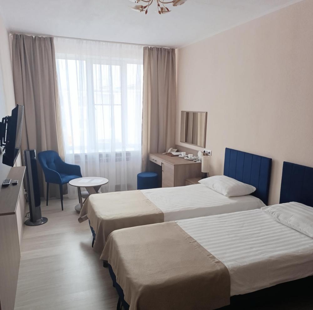 Однокомнатный номер, в котором размещена комната, прихожая и санузел. В номере: две кровати, шкаф для одежды, письменный стол, телевизор, телефон, холодильник, набор посуды. В ванной комнате: душевая кабина, средства индивидуальной гигиены, комплект полотенец. Смена постельного белья – раз в три дня, смена полотенец – ежедневно.