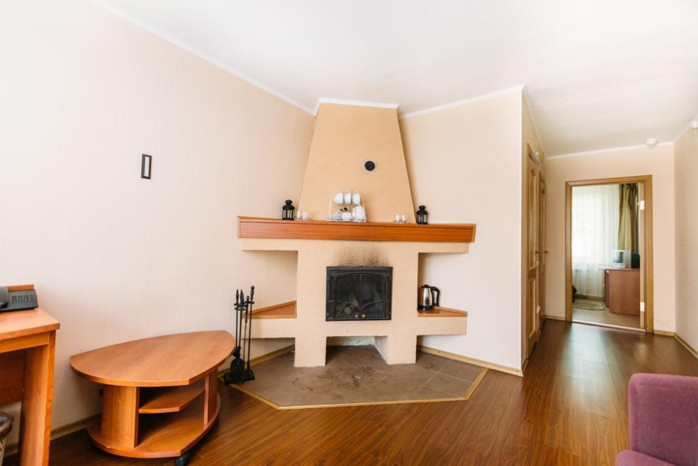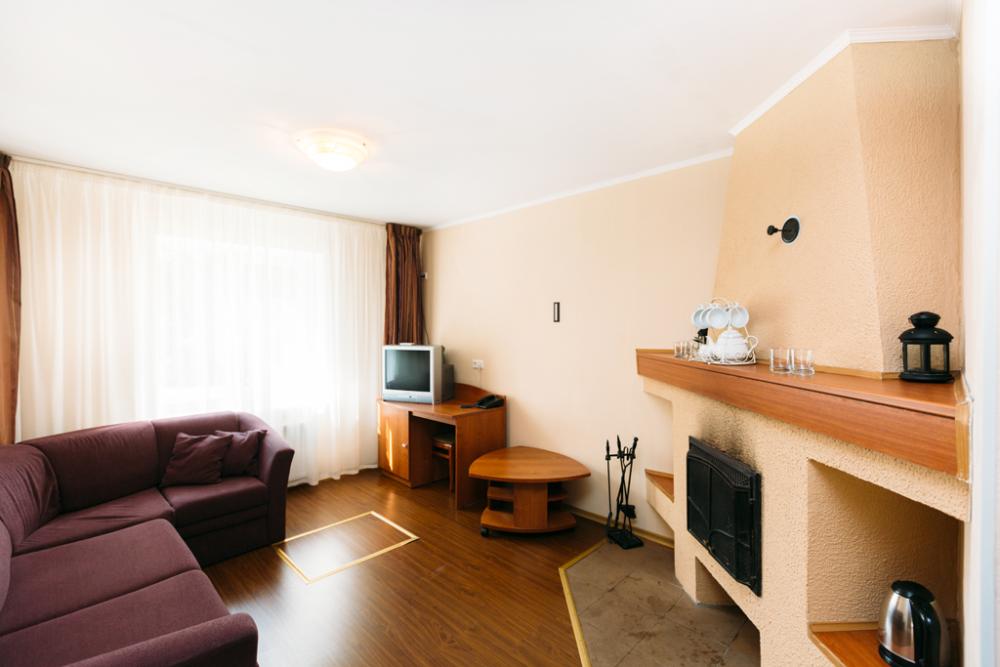 Двухкомнатный номер люкс, оборудованный всем необходимым для комфортного проживания. В номере: спальня, гостиная, двуспальная кровать, стол, шкаф, кресло-кровать, диван-кровать, прикроватные тумбочки, телефон, телевизор, балкон. В ванной: туалет, раковина, душ, средства личной гигиены, набор полотенец.