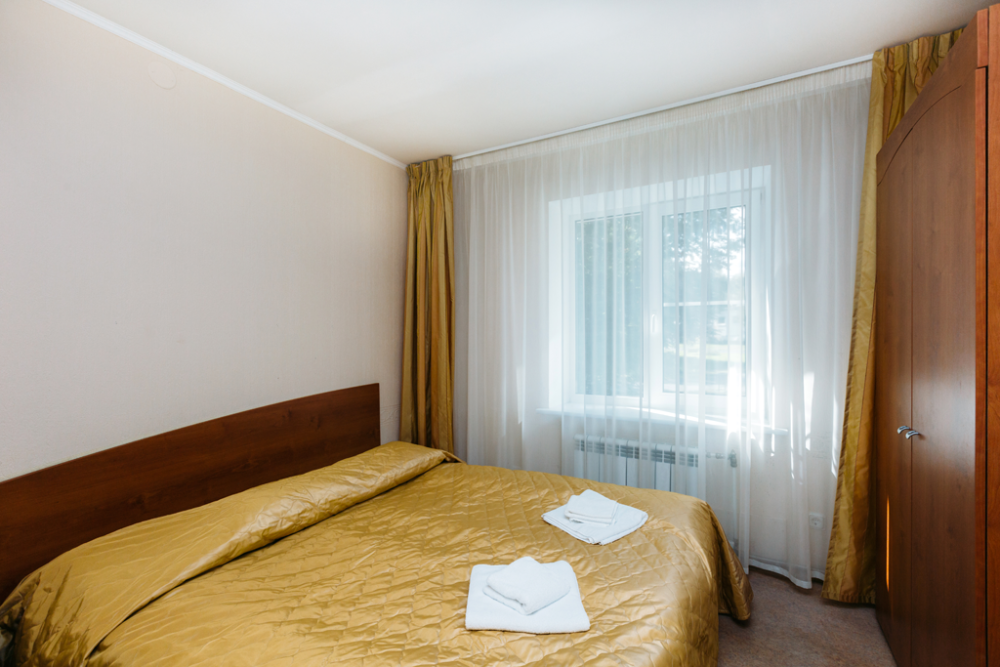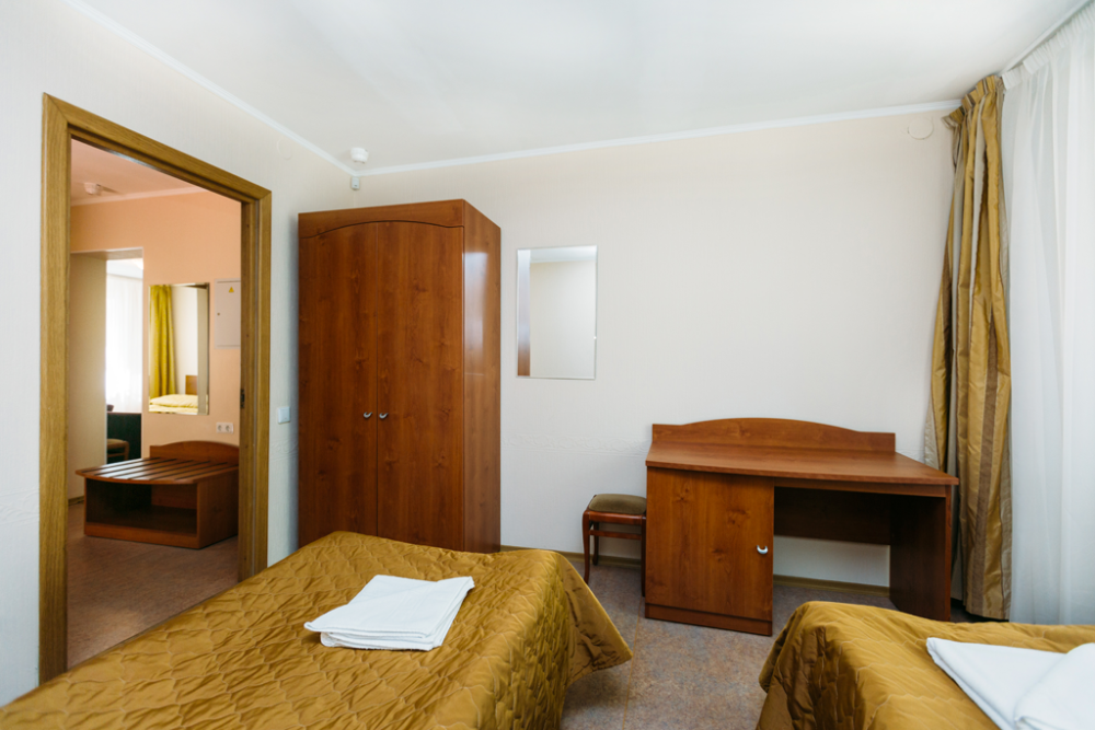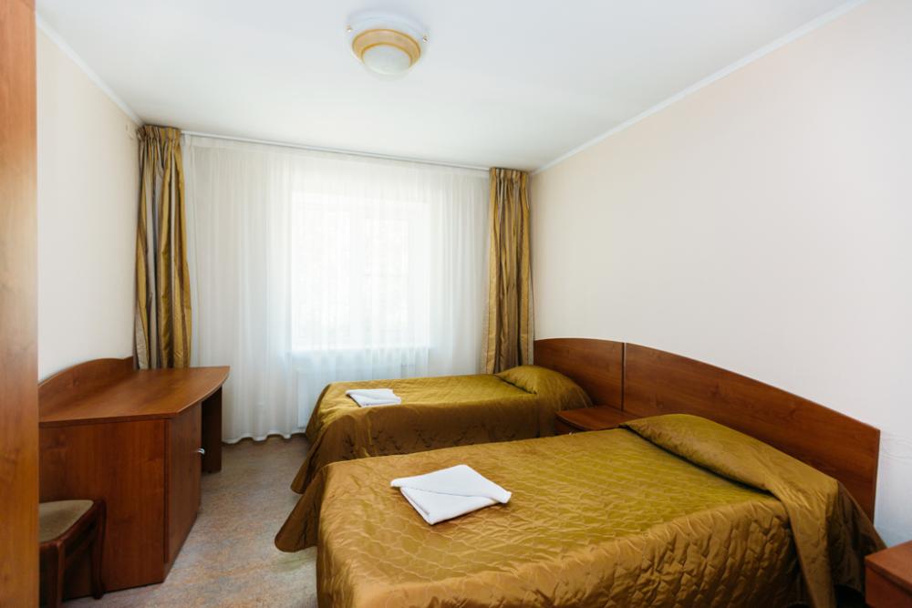 Номер стандарт с 2 полутороспальными кроватями, оборудованный всем необходимым для комфортного проживания. В номере: две полутороспальные кровати, стол, шкаф, кресло-кровать, прикроватные тумбочки, сейф, телефон, телевизор, балкон. В ванной: туалет, раковина, душ, средства личной гигиены, набор полотенец.
