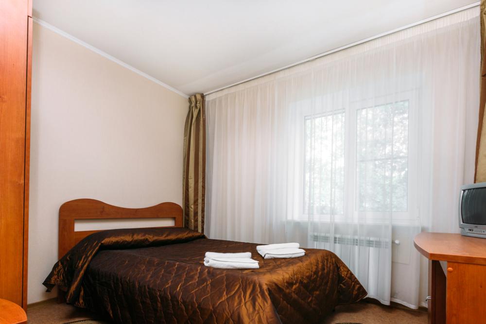 Одноместный номер - это максимально уютное пространство площадью с видом на сосновый лес. Комплектация номера: 1 большая полутороспальная кровать, телевизор, зона для чаепития, изящная чайная пара, чайник и ароматный чай, холодильник, удобные стулья, вместительный шкаф, тумбочка, зеркало, тапочки, туалет и ванная комната с различными приятными мелочами по уходу за собой, включая фен.