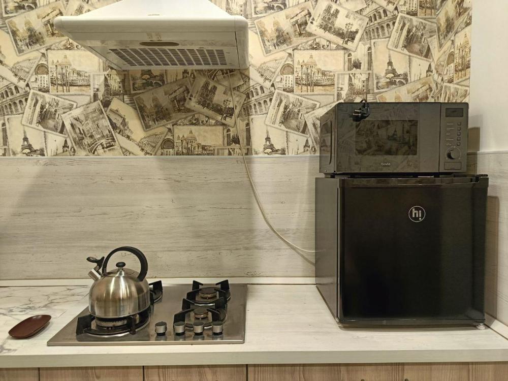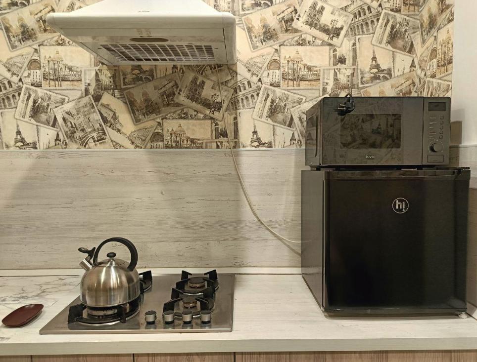 - На кухне: холодильник, чайник, микроволновка, посуда и столовые приборы на 4 персоны