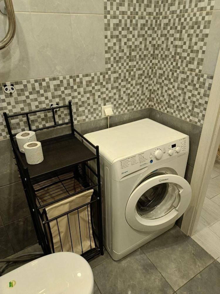 - В ванной стиральная машинка, средство для стирки, гель для душа, шампунь, жидкое мыло
