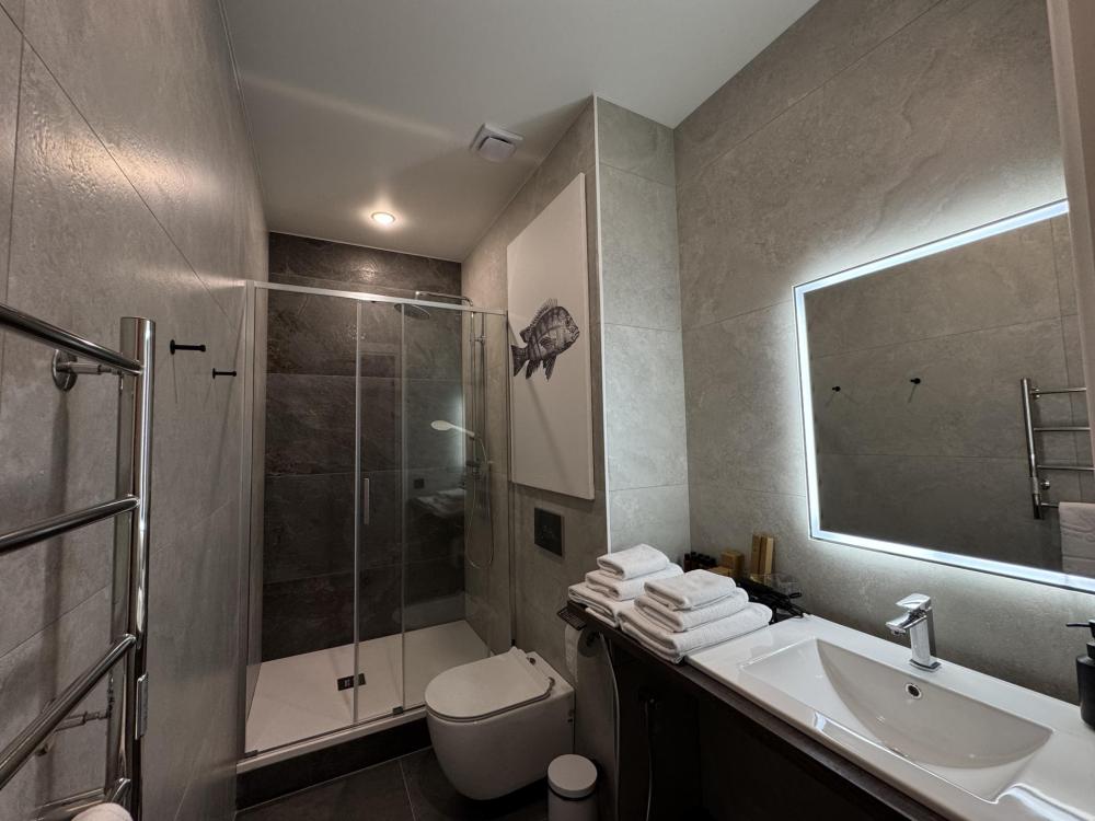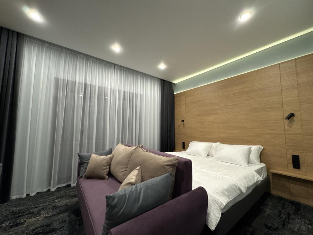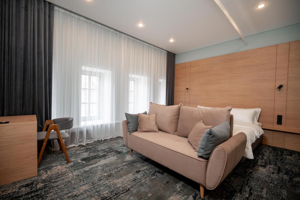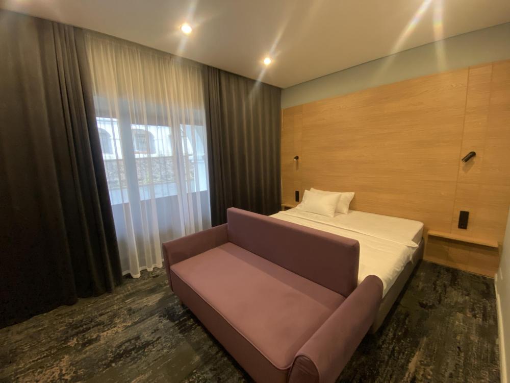 Просторный и светлый номер категории «Комфорт» идеально подойдёт для отдыха и работы. В номере есть большая двуспальная кровать, удобный диван, рабочая зона, телевизор, холодильник и собственная ванная комната с душевой кабиной.