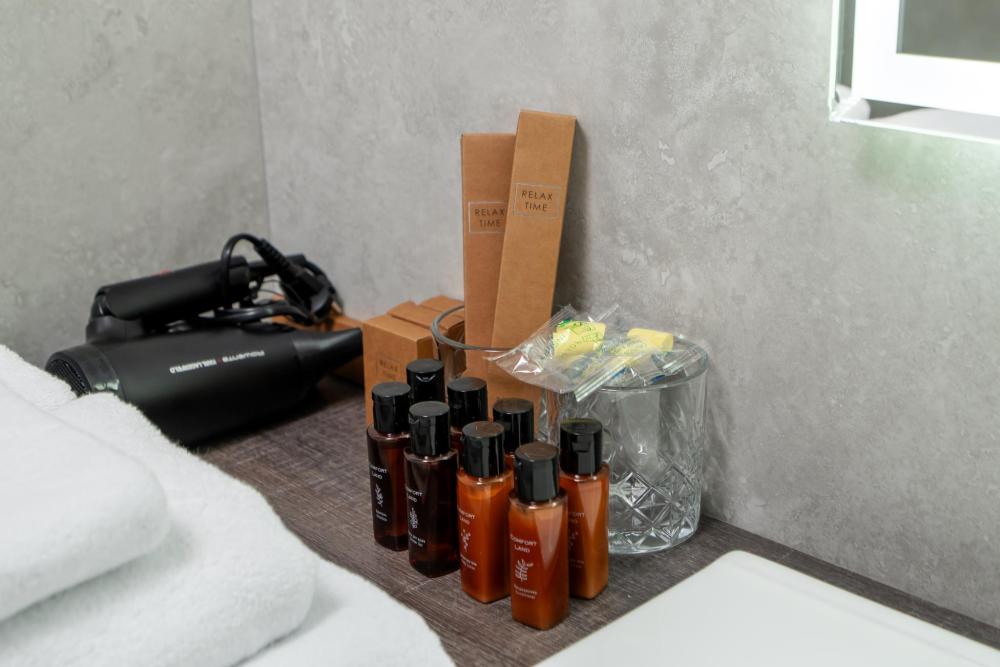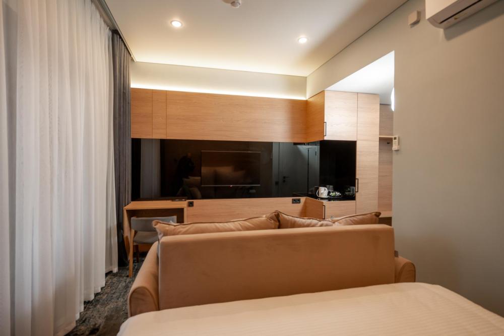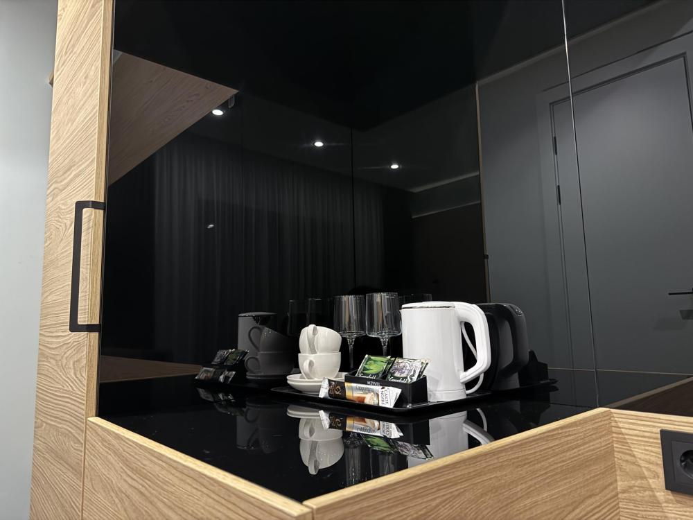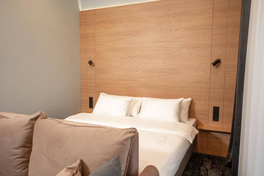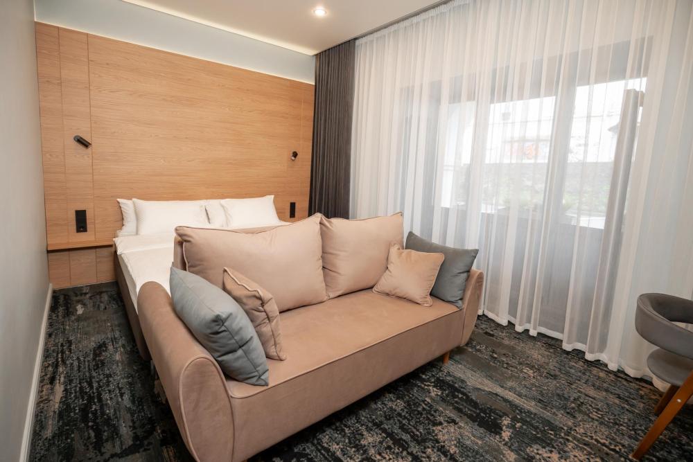 Просторный и светлый номер категории «Комфорт» идеально подойдёт для отдыха и работы. В номере есть большая двуспальная кровать, удобный диван, рабочая зона, телевизор, холодильник и собственная ванная комната с душевой кабиной.