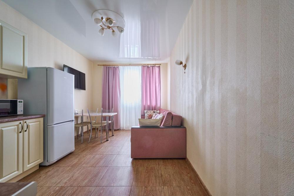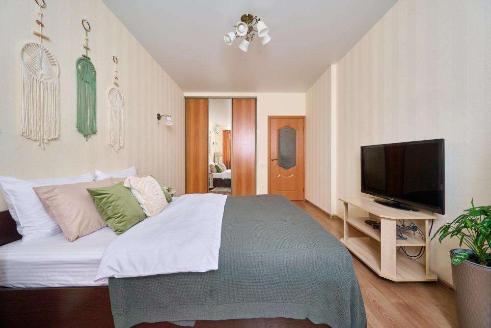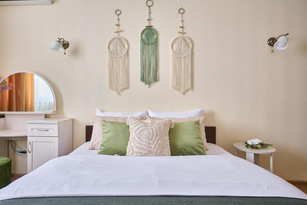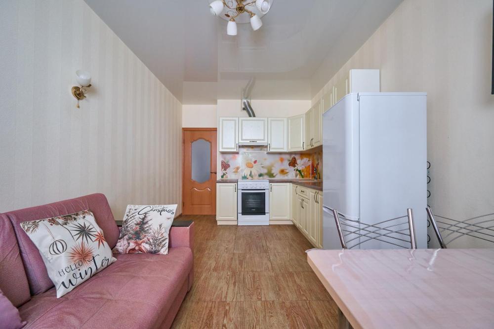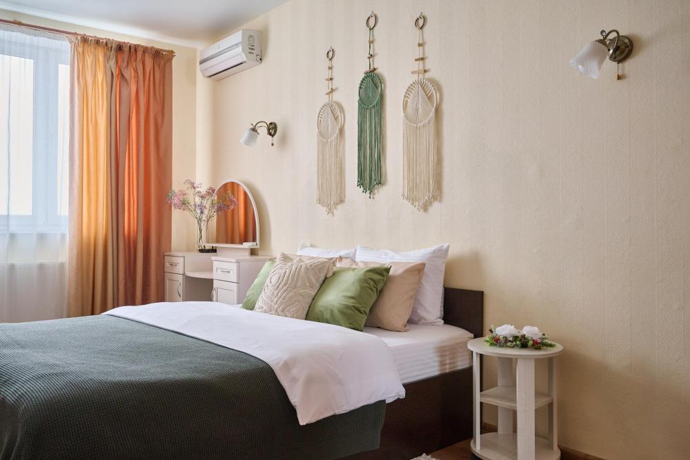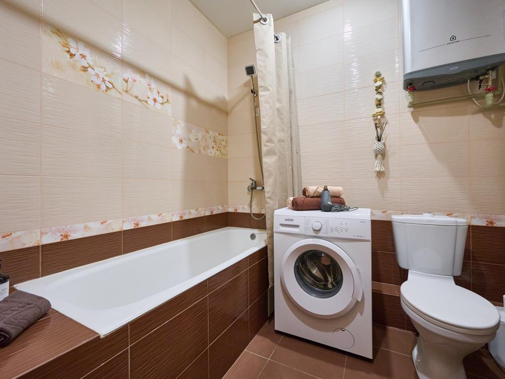 Двуспальная кровать 160х200 с белоснежным постельным бельем и раскладной диван 140х190 ? 2 ЖК телевизора: smart в кухне + в комнате ?Бесплатный Wi-Fi Кондиционер Ванна, стиральная машина, водонагреватель, средства гигиены (шампунь, гель для душа, мыло), махровые полотенца (по 2 каждому гостю) Сушилка для одежды, гладильная доска, утюг ? Эл.плита, холодильник, микроволновая печь, комплект посуды и столовых приборов ?электрический чайник, фен, пылесос Приветственные наборы для гостей: чай, кофе, турка для кофе, сахар, специи. По запросу предоставляем еженедельную уборку при проживании более 1 недели.
