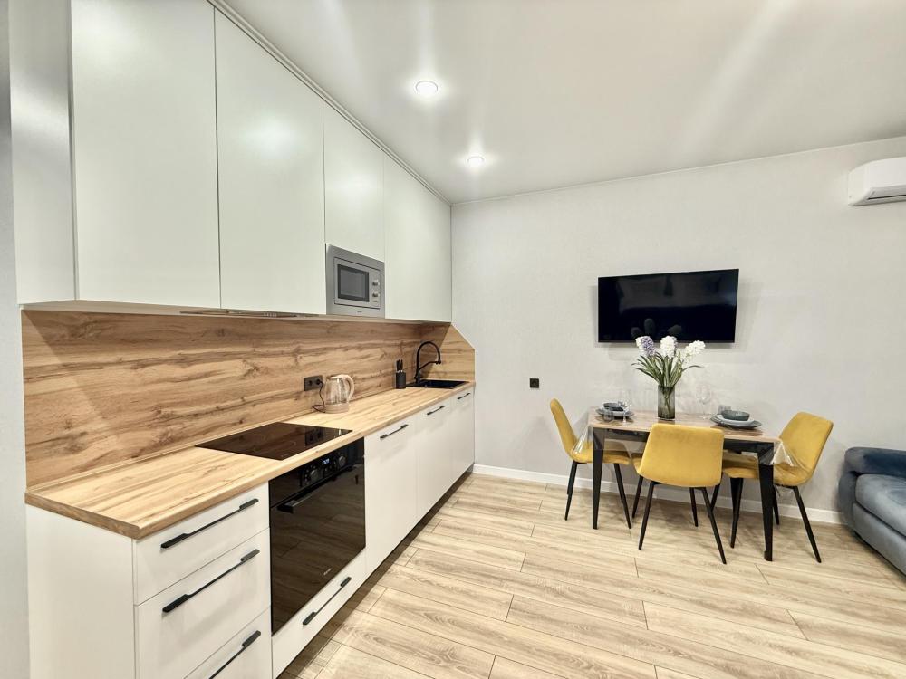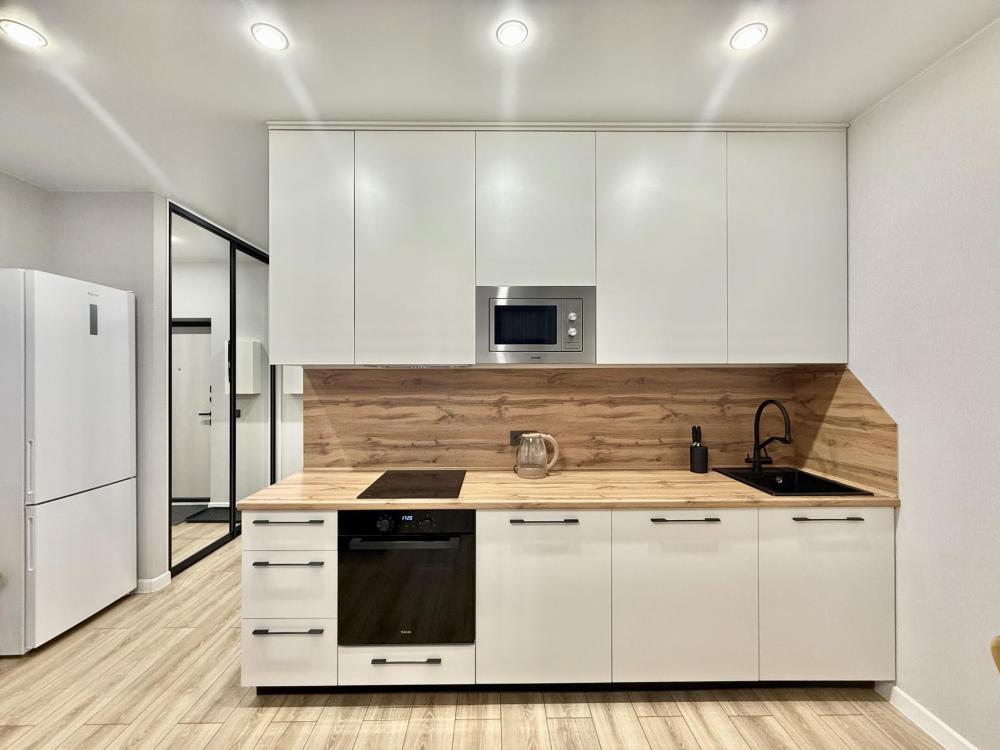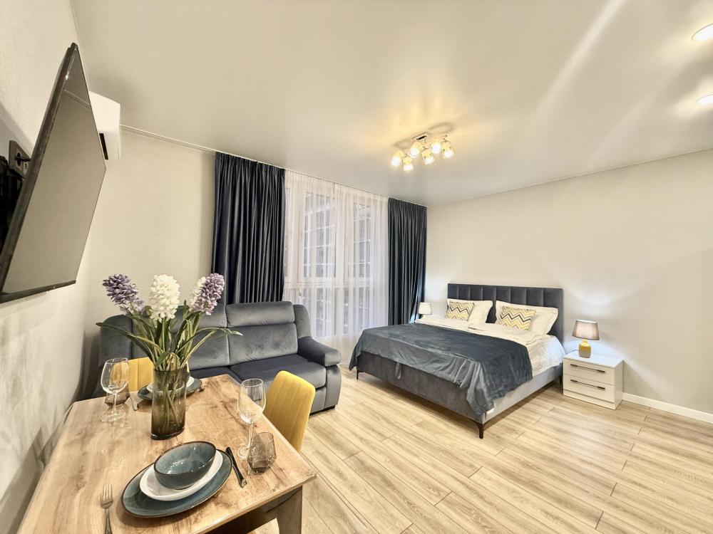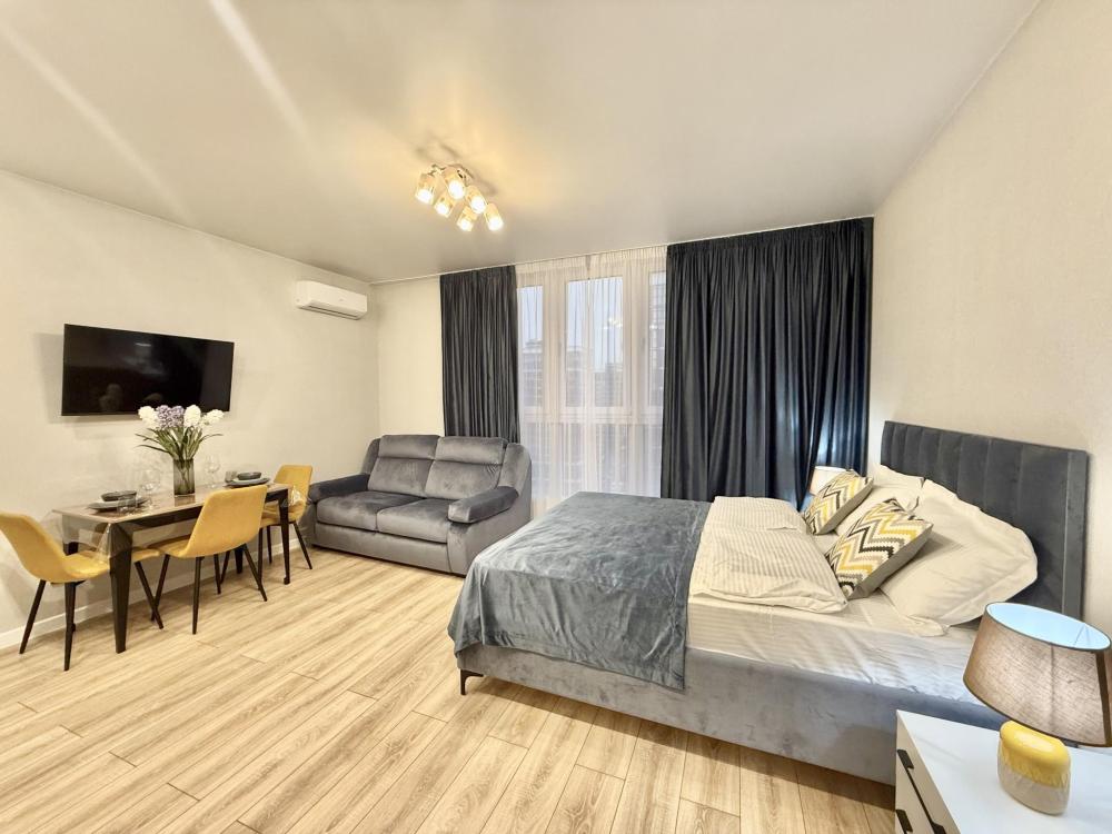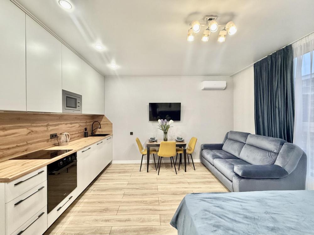 Уютные апартаменты, оборудованные всем необходимым для комфортного проживания. В апартаментах: двуспальная кровать с ортопедическим матрасом и двуспальный диван-кровать, высокоскоростной безлимитный Wi-FI и смарт ТВ, полноценная кухня с зоной готовки и бытовой техникой: посудомоечная машина, холодильник, варочная панель, духовой шкаф, СВЧ-печь, электрический чайник, необходимые мелочи для жизни: стиральная машина, сплит-система, фен, утюг, гладильная доска, сушилка, а так же посуда и столовые приборы, белоснежное хлопковое постельное белье и полотенца.