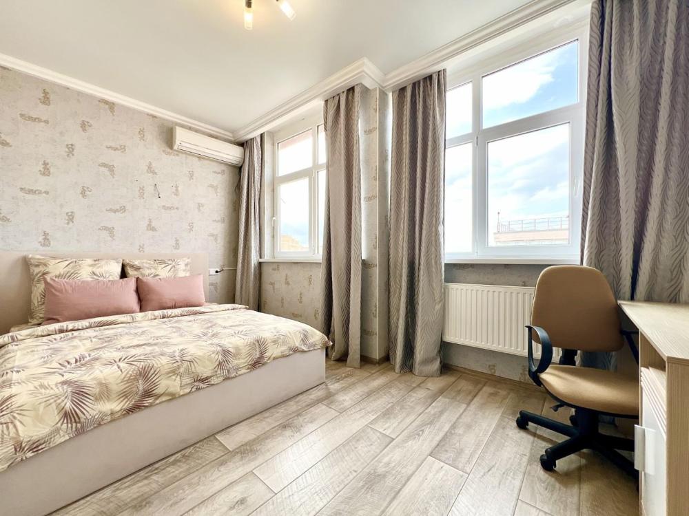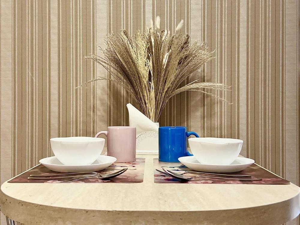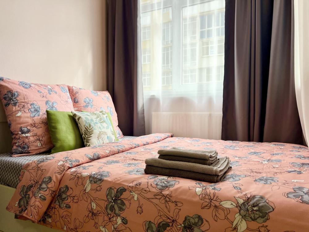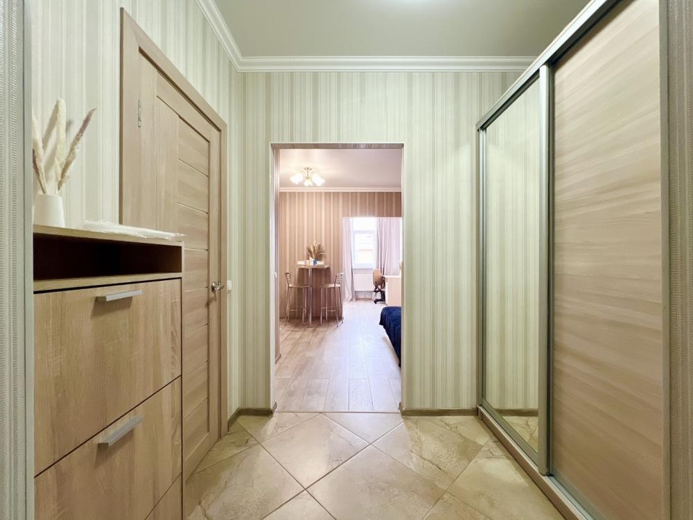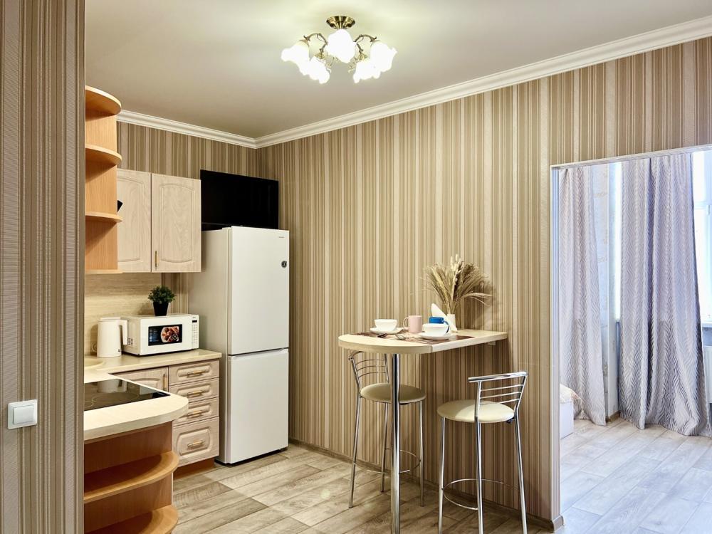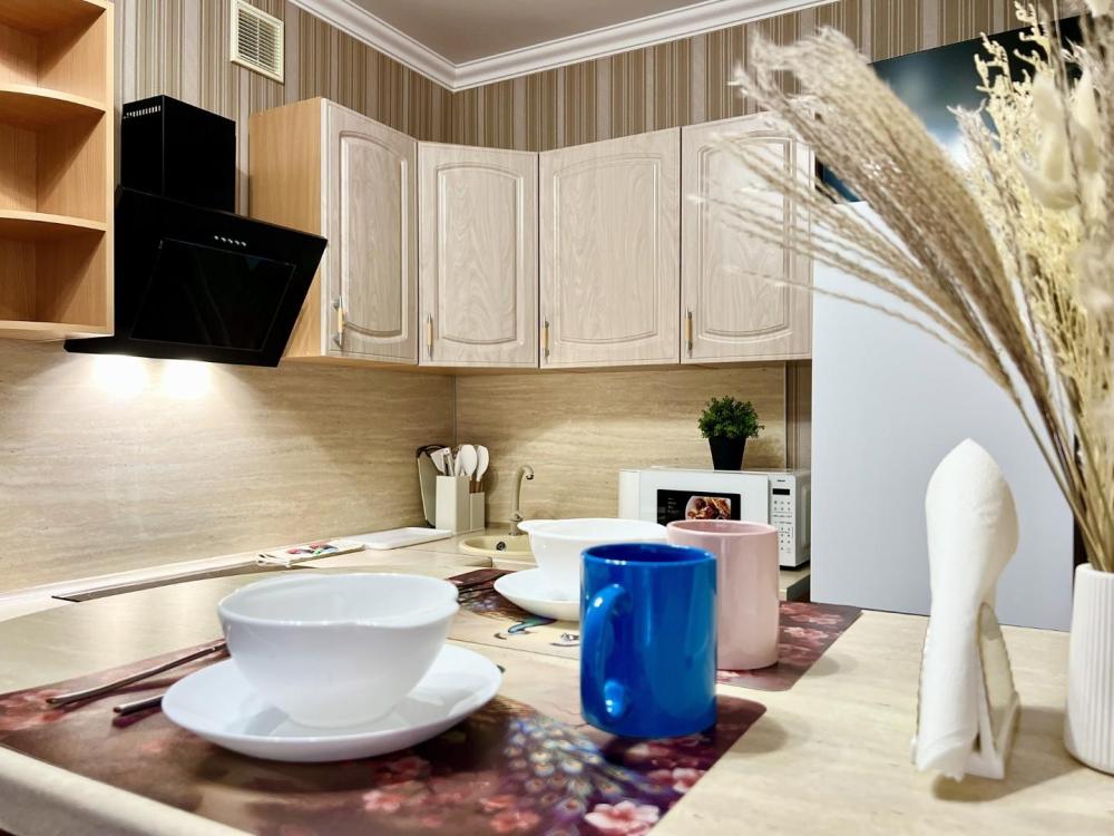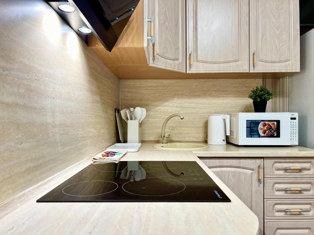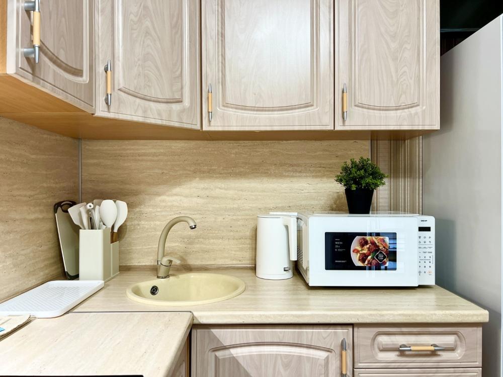 Уютные апартаменты студия, оборудованные всем необходимым для комфортного проживания. В апартаментах: двуспальная кровать, раскладной диван, полностью оборудованная кухне с бытовой техникой и посудой, есть плита, электрический чайник, микроволновая печь и холодильник, стиральная машина, утюг и гладильная доска. Ванная комната с чистой и исправной сантехникой, всегда горячая и холодная вода т.к. есть бойлер. Всегда свежие полотенца и постельное бельё. Также в квартире имеется Wi-Fi и TV.