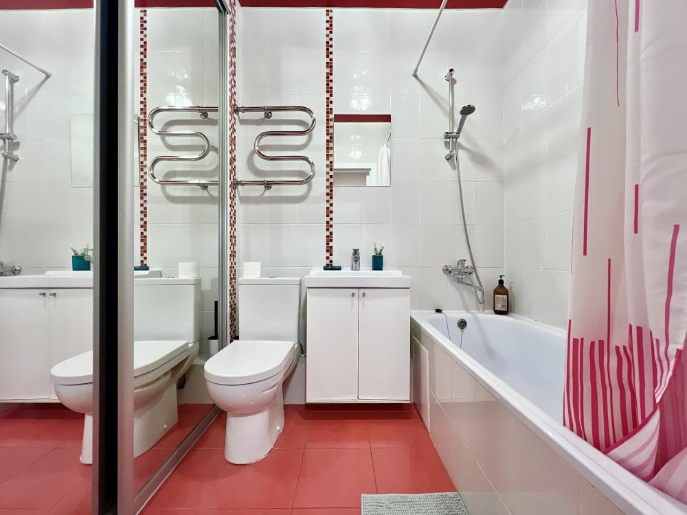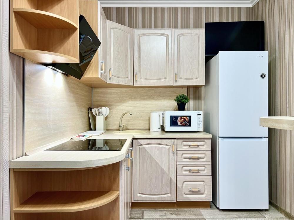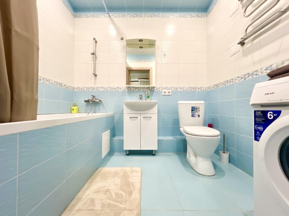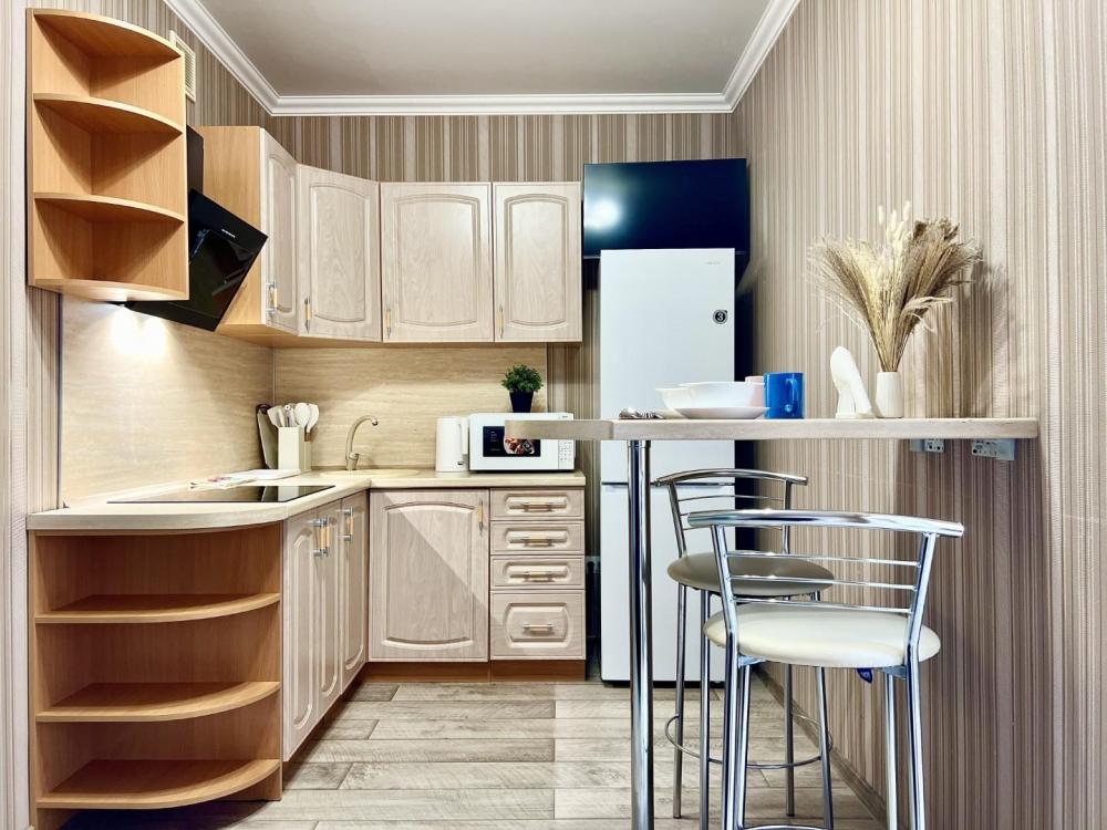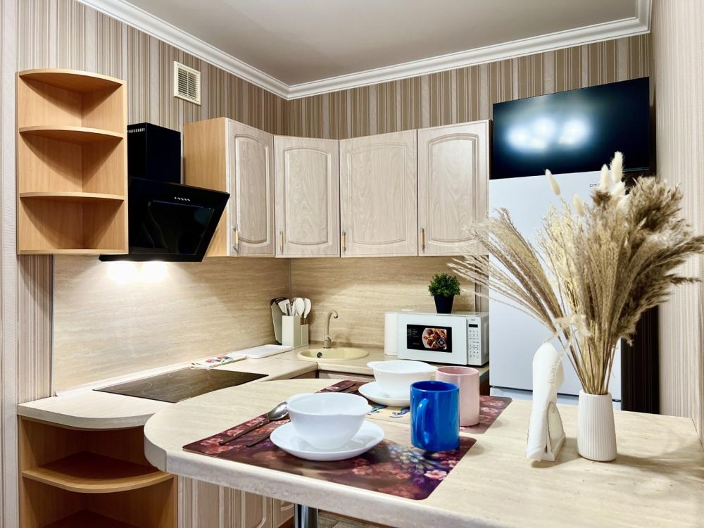 Уютные однокомнатные апартаменты, оборудованные всем необходимым для комфортного проживания. В апартаментах: двуспальная кровать, раскладной диван, полностью оборудованная кухне с бытовой техникой и посудой, есть плита, электрический чайник, микроволновая печь и холодильник, стиральная машина, утюг и гладильная доска. Ванная комната с чистой и исправной сантехникой, всегда горячая и холодная вода т.к. есть бойлер. Всегда свежие полотенца и постельное бельё. Также в квартире имеется Wi-Fi и TV.