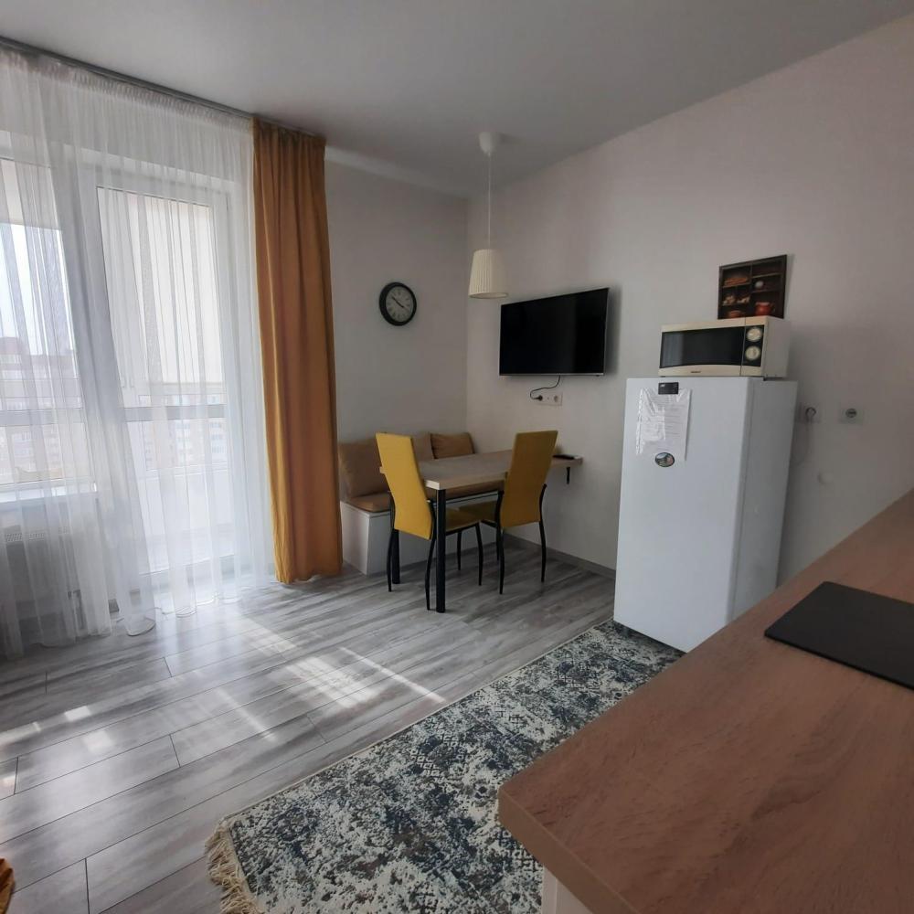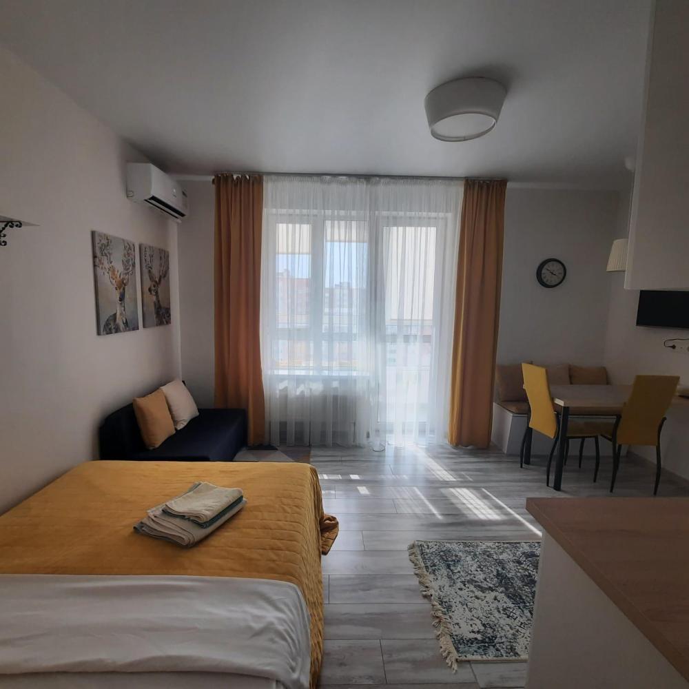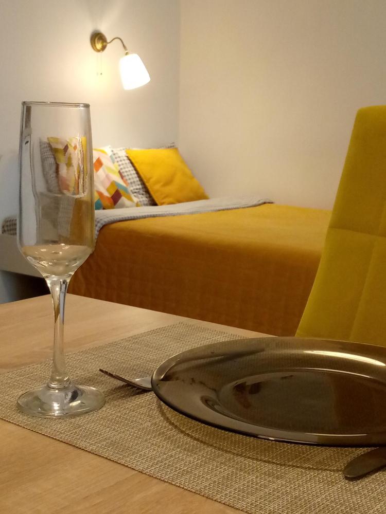 1-комнатные апартаменты стандарт Квартира оборудована всем необходимым для комфортного проживания: двуспальная кровать, диван, кухонная зона, телевизор, обеденный стол, собственная ванная комната и туалет.
