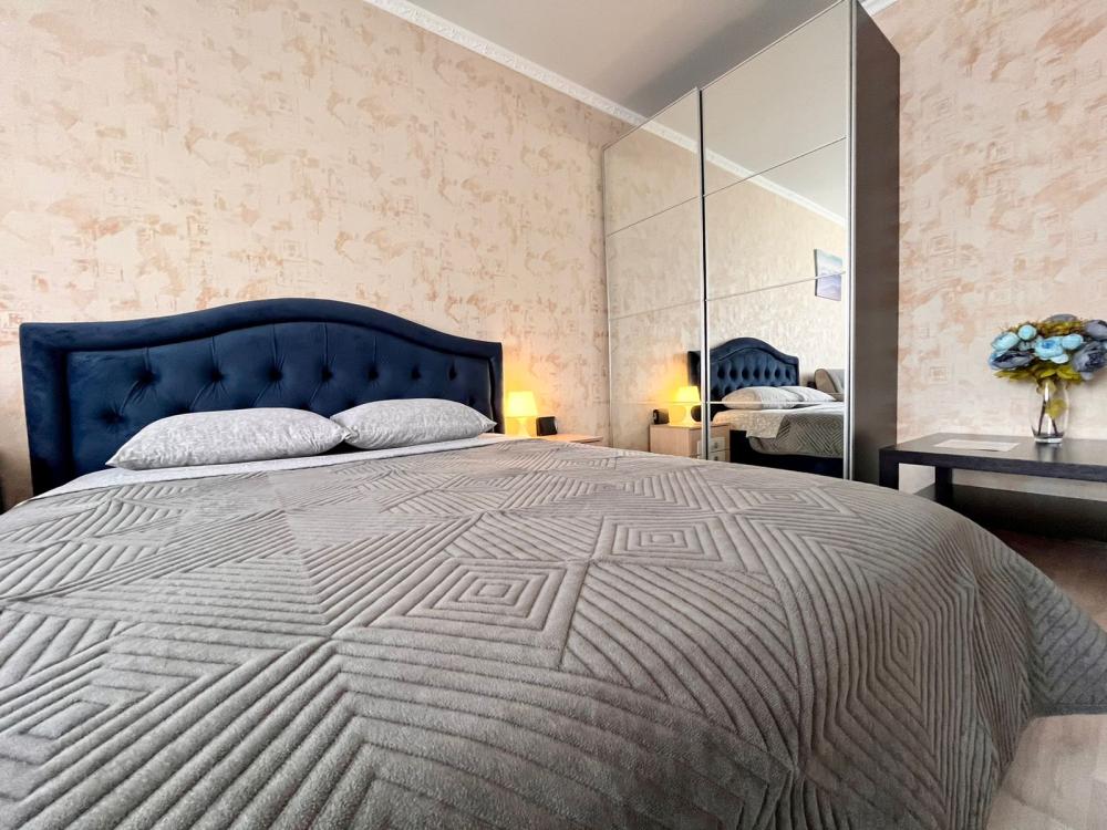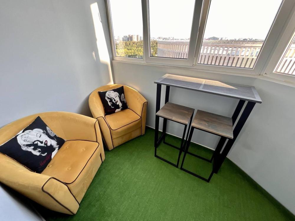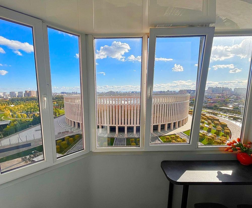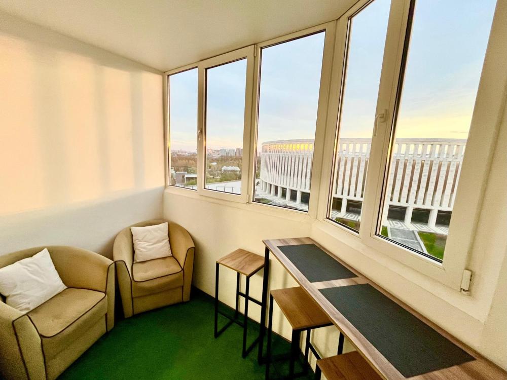 Апартаменты с видом на стадион, с возможностью размещения до шести гостей. Имеется все необходимое для комфортного проживания. Спальные места 2+2+2, двуспальная кровать с высоким матрасом Икеа, двухместный диван в комнате и доп. диван на кухне. Микроволновая печь, электроплита, чайник, холодильник, необходимая посуда. Телевизор смарт, интернет и телевидение, сплит.система.