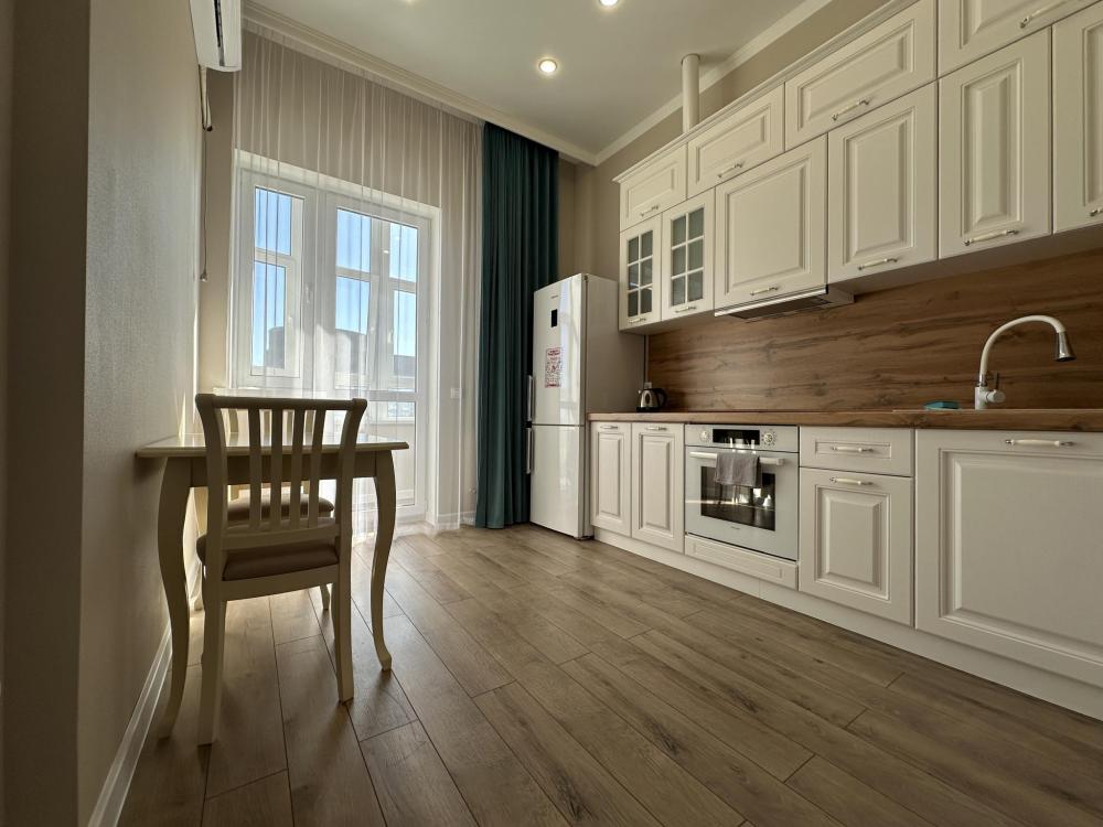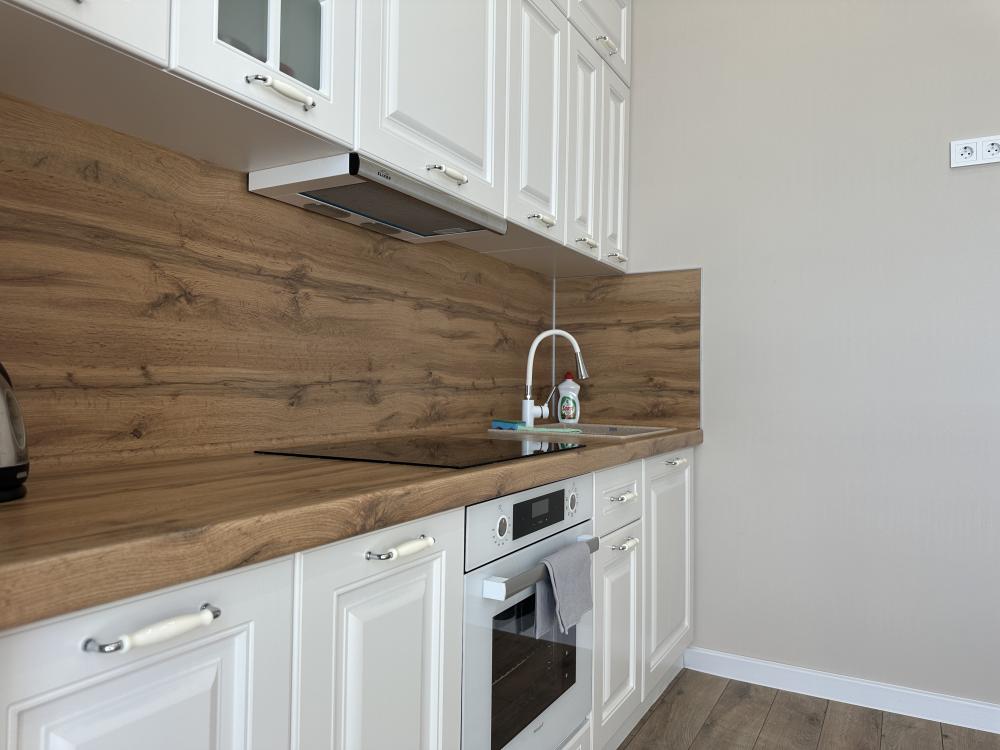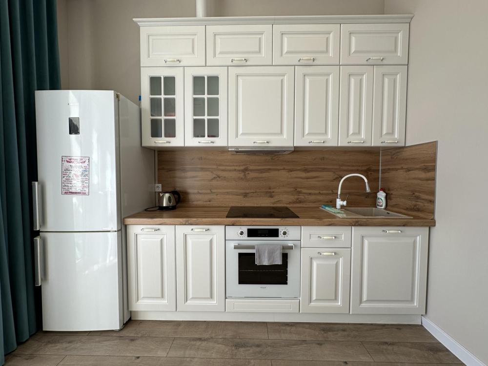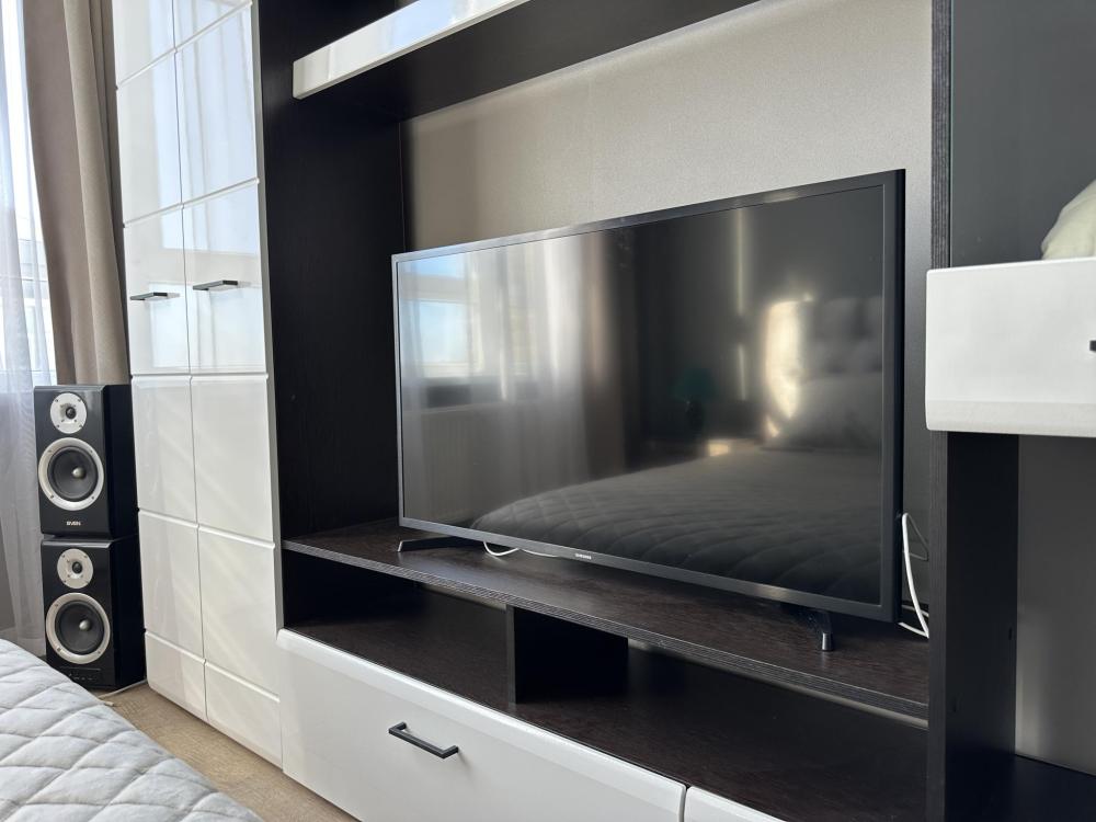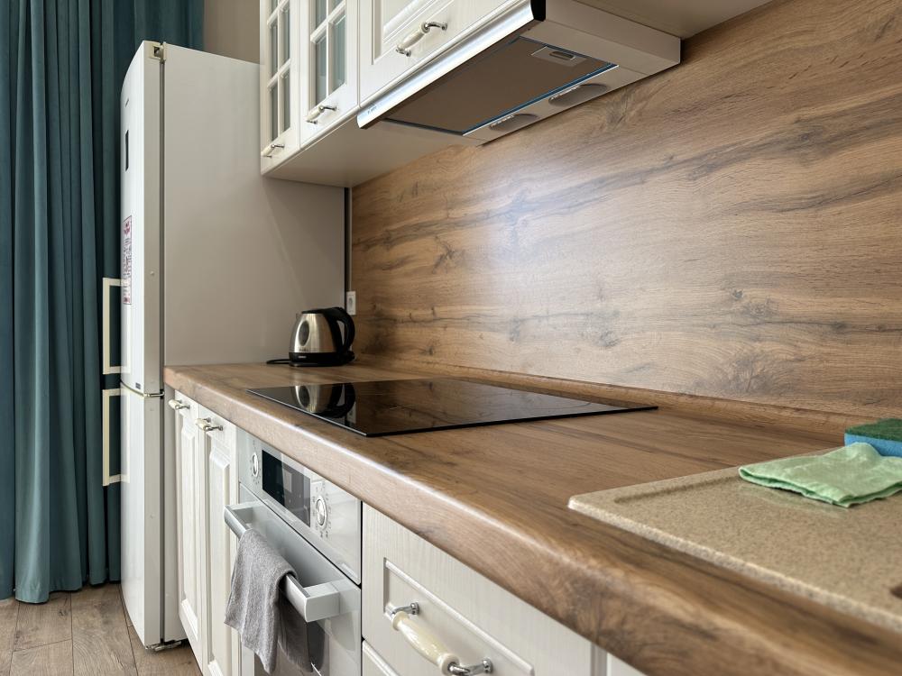 В квартире: стиральная машина, водонагреватель, холодильник, микроволновка, электрочайник, печь, посуда, фен, утюг, гладильная доска, чистое постельное бельё и полотенца, Wi‑Fi, Smart‑TV.
