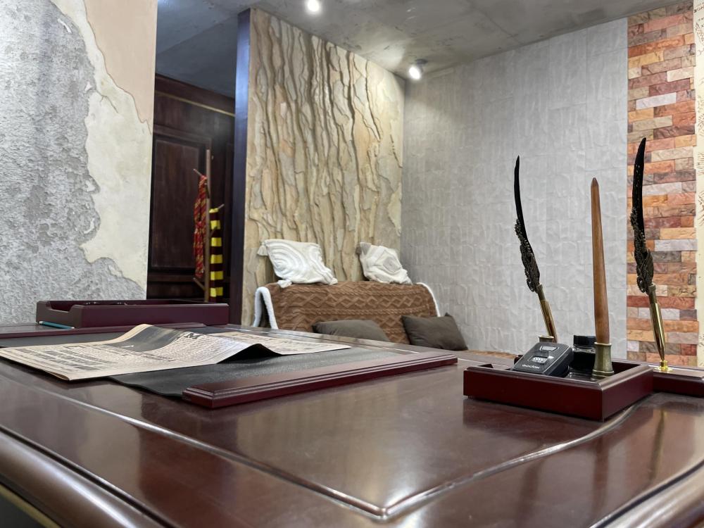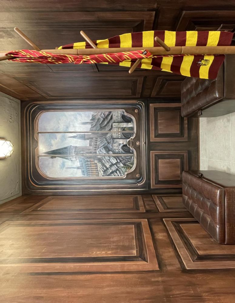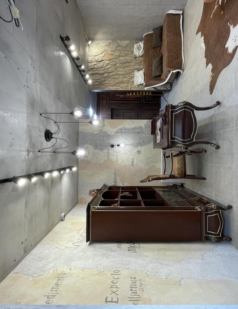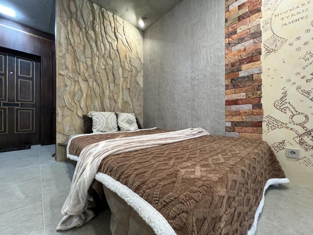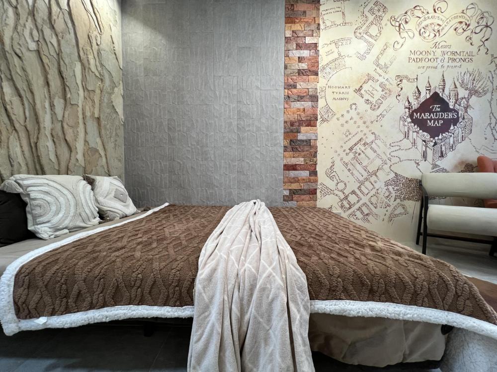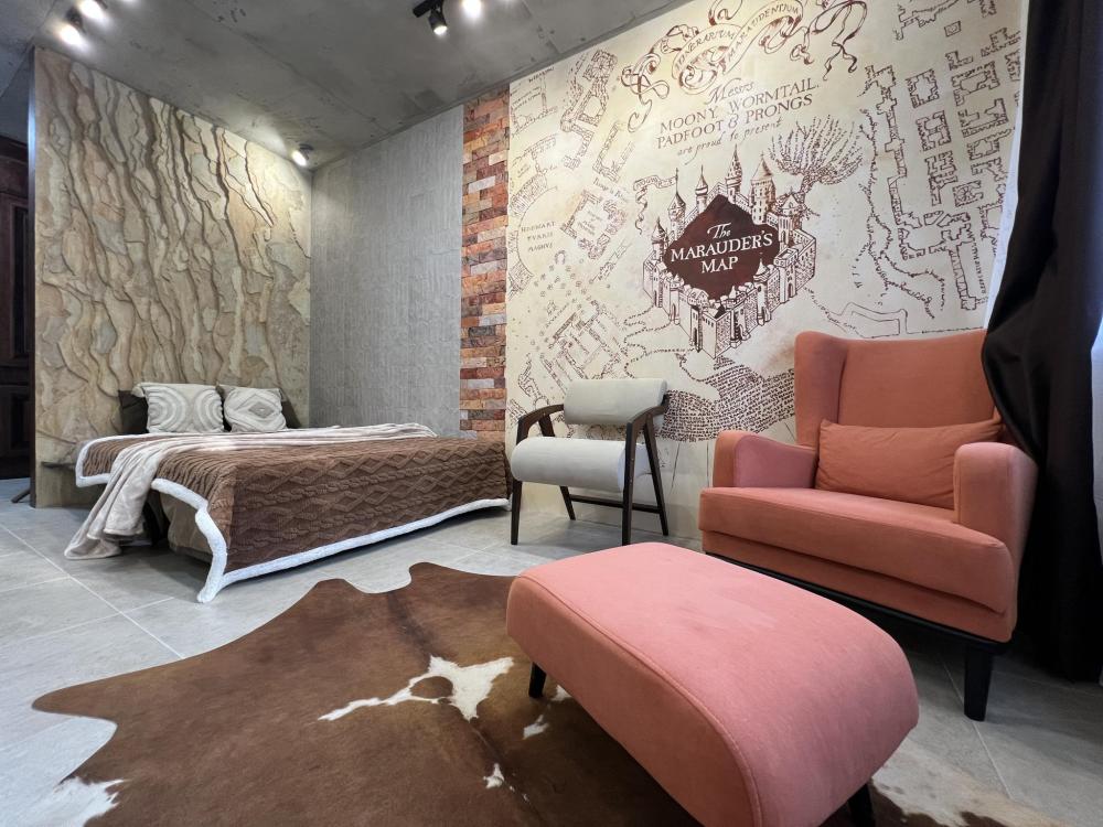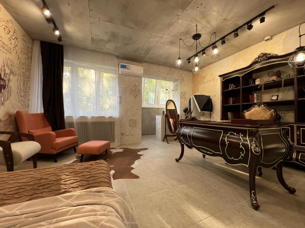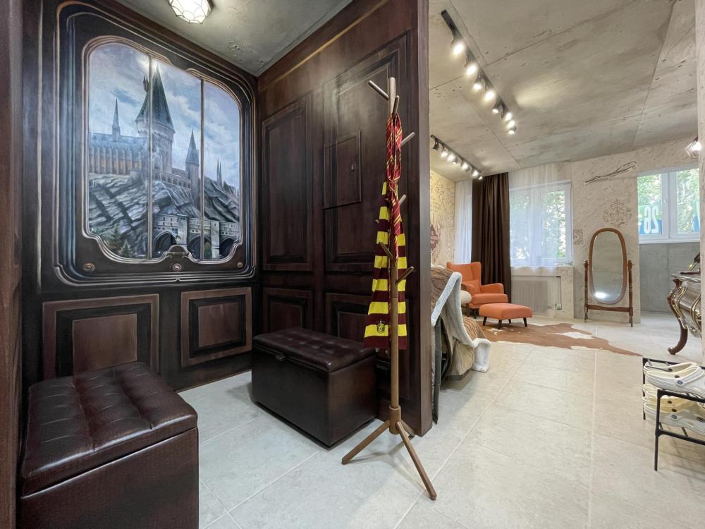 Студия в стиле Хогвартс, без кухни, есть ванная. Двуспальный диван, ТВ отсутствует.