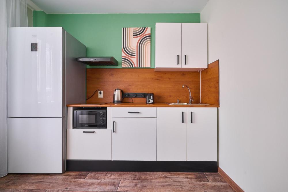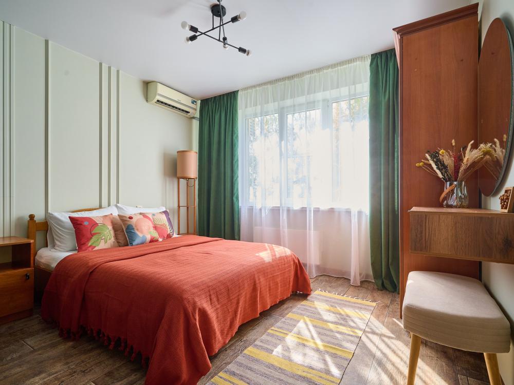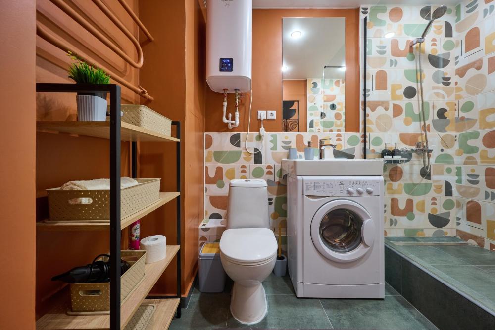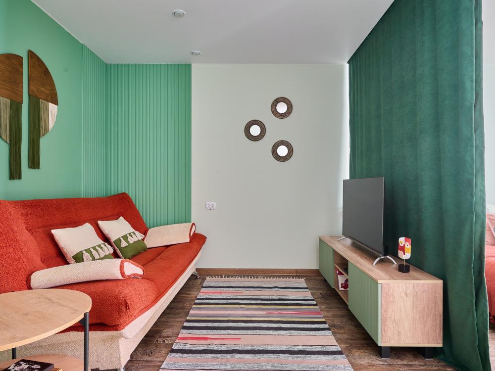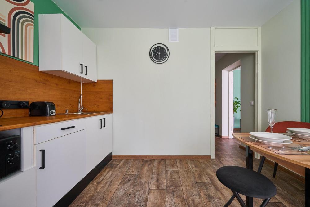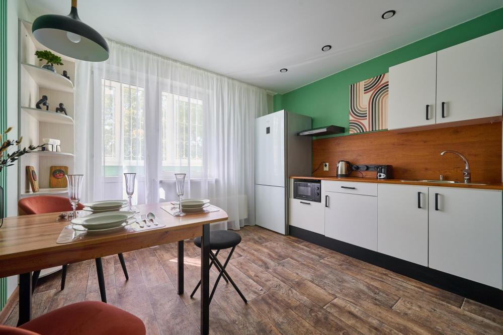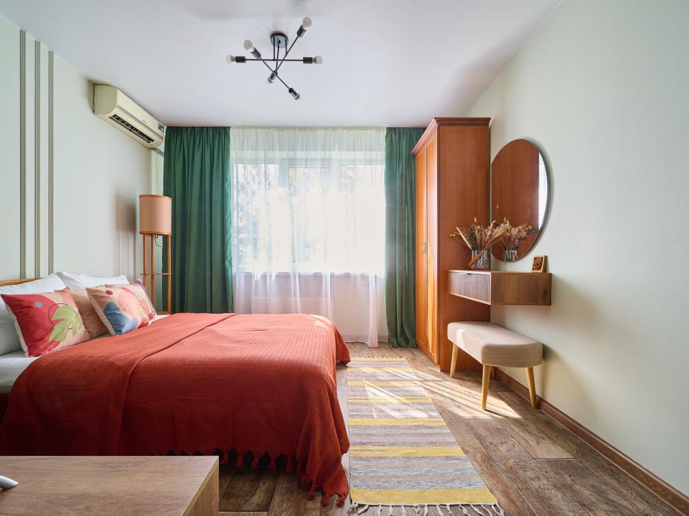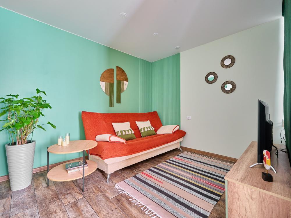 -комната: двуспальная кровать, белоснежное постельное белье, диван-книжка, Smart-TV, кондиционер, Wi-Fi; - кухня: вся кухонная мебель, холодильник, электрическая плита, вытяжка, микроволновая печь, электрический чайник, тостер, турка для кофе, комплект посуды и столовых приборов; - санузел совмещенный: удобная душевая зона, полотенца по количеству гостей, фен, средства гигиены, водонагреватель, стиральная машина; - утюг, гладильная доска, сушилка для белья.